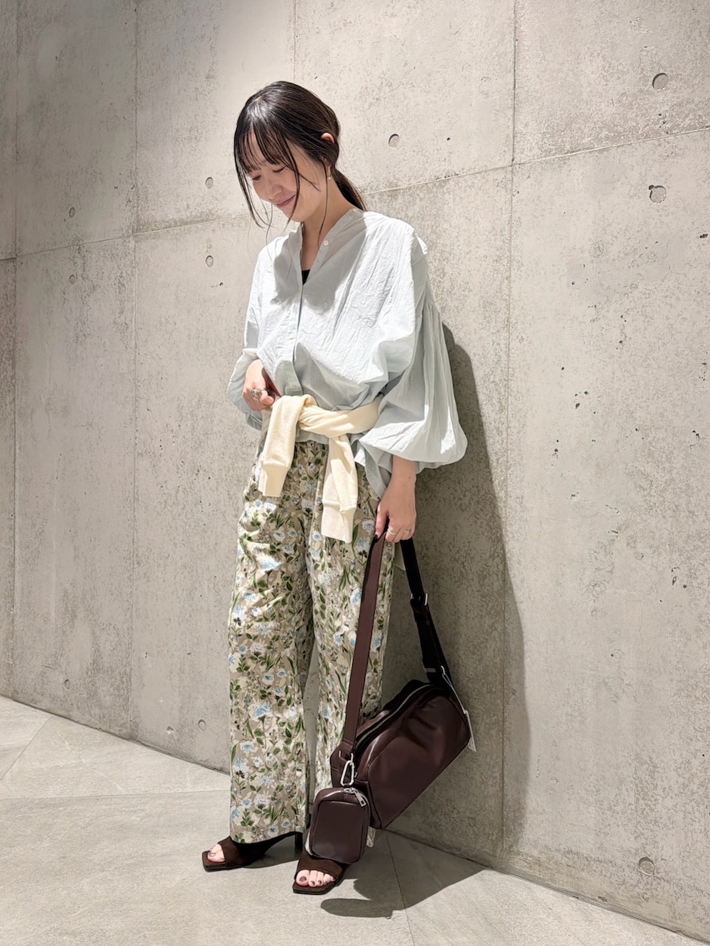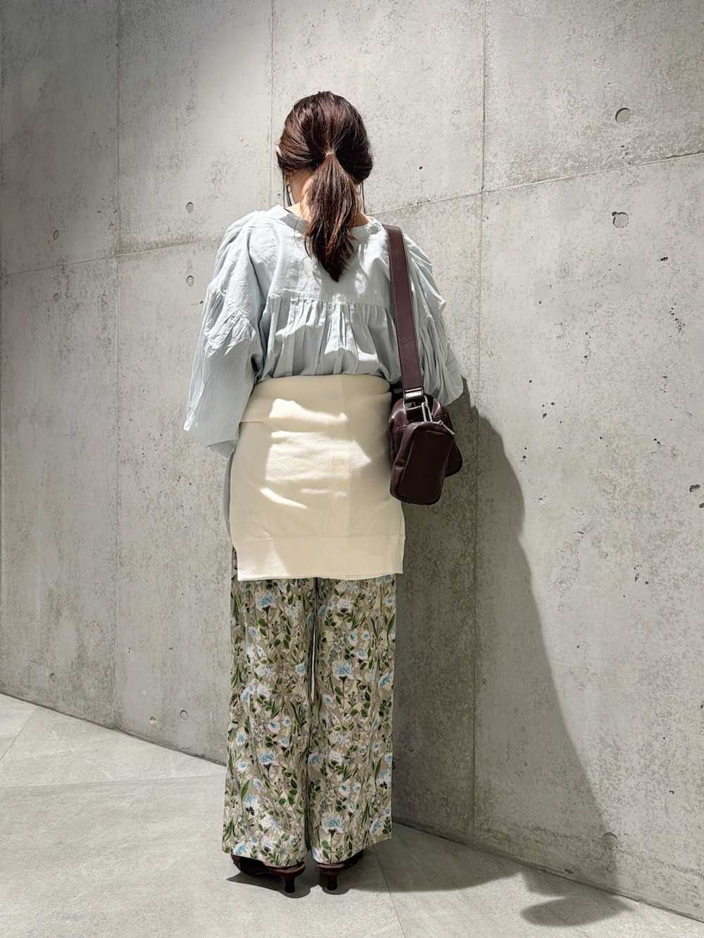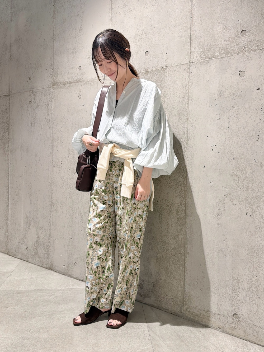 今回は、花柄のイージーパンツと合わせて、春らしく明るいコーディネートにしてみました。
