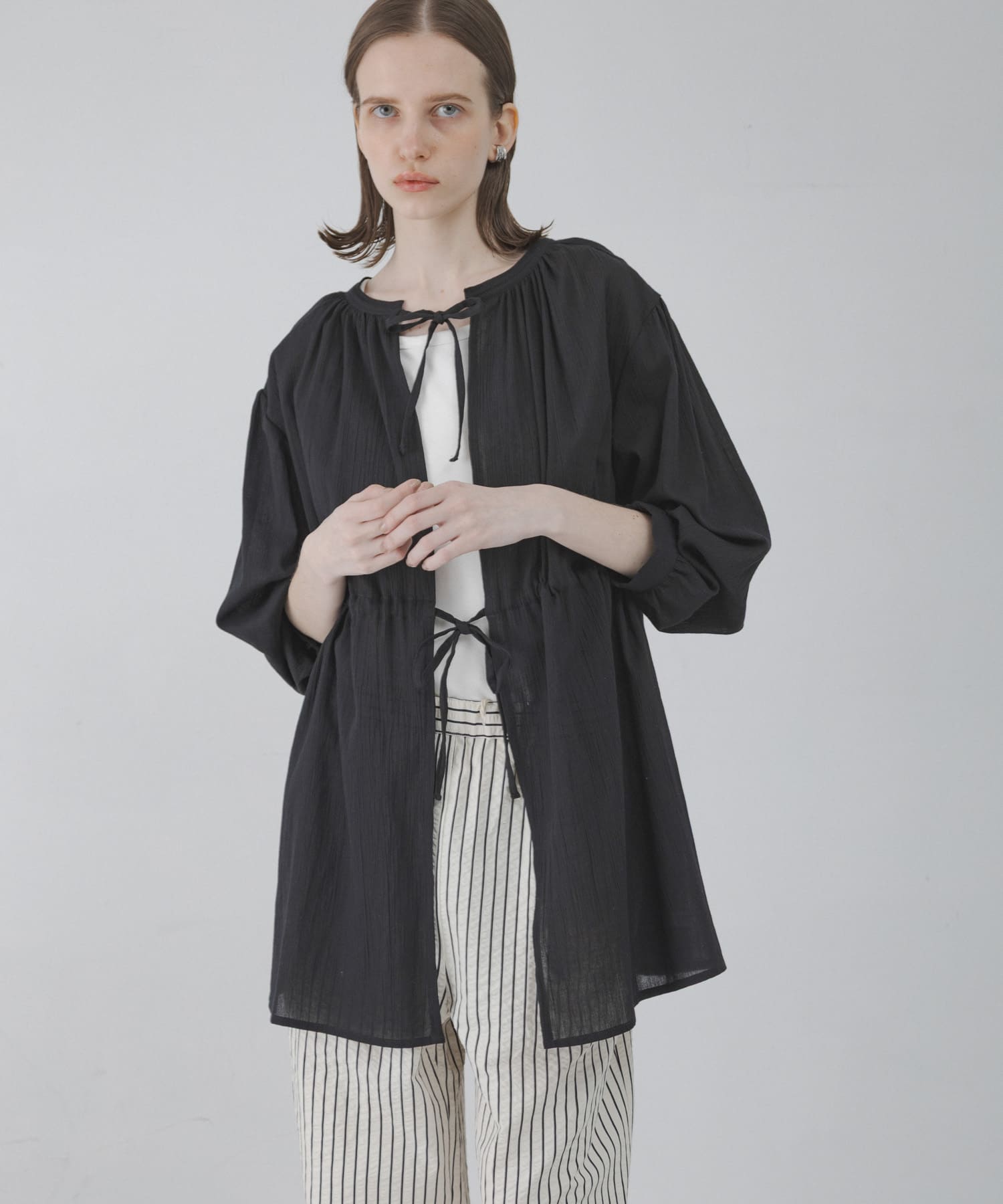 透け感のある楊柳素材が涼しげな印象のブラウス。