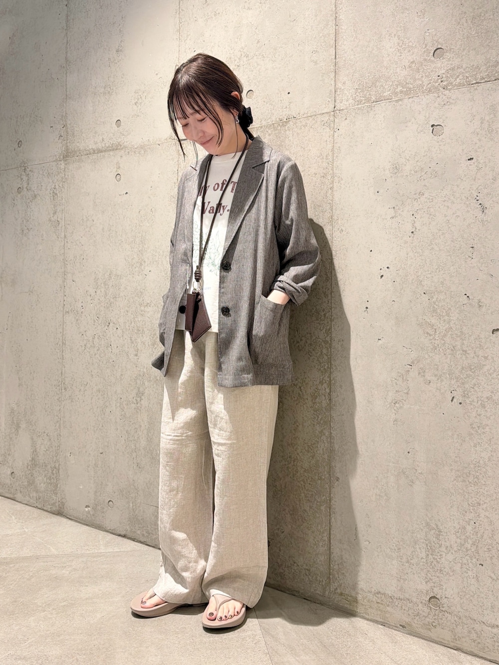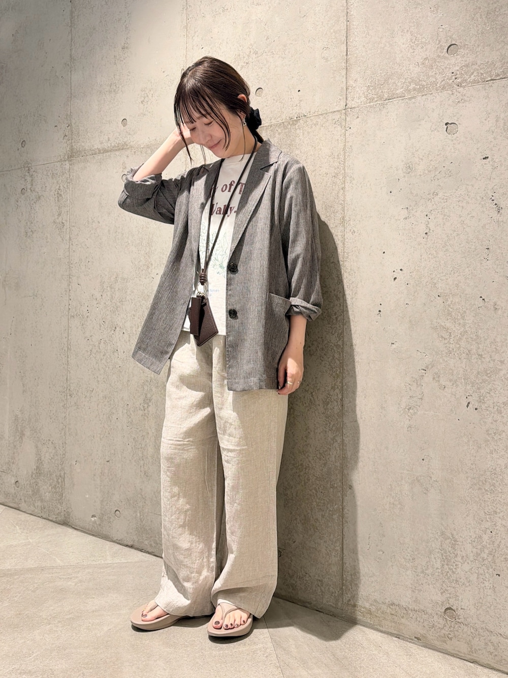 今回は、プリントTシャツに、リネンパンツでリラックス感のあるコーディネートです。