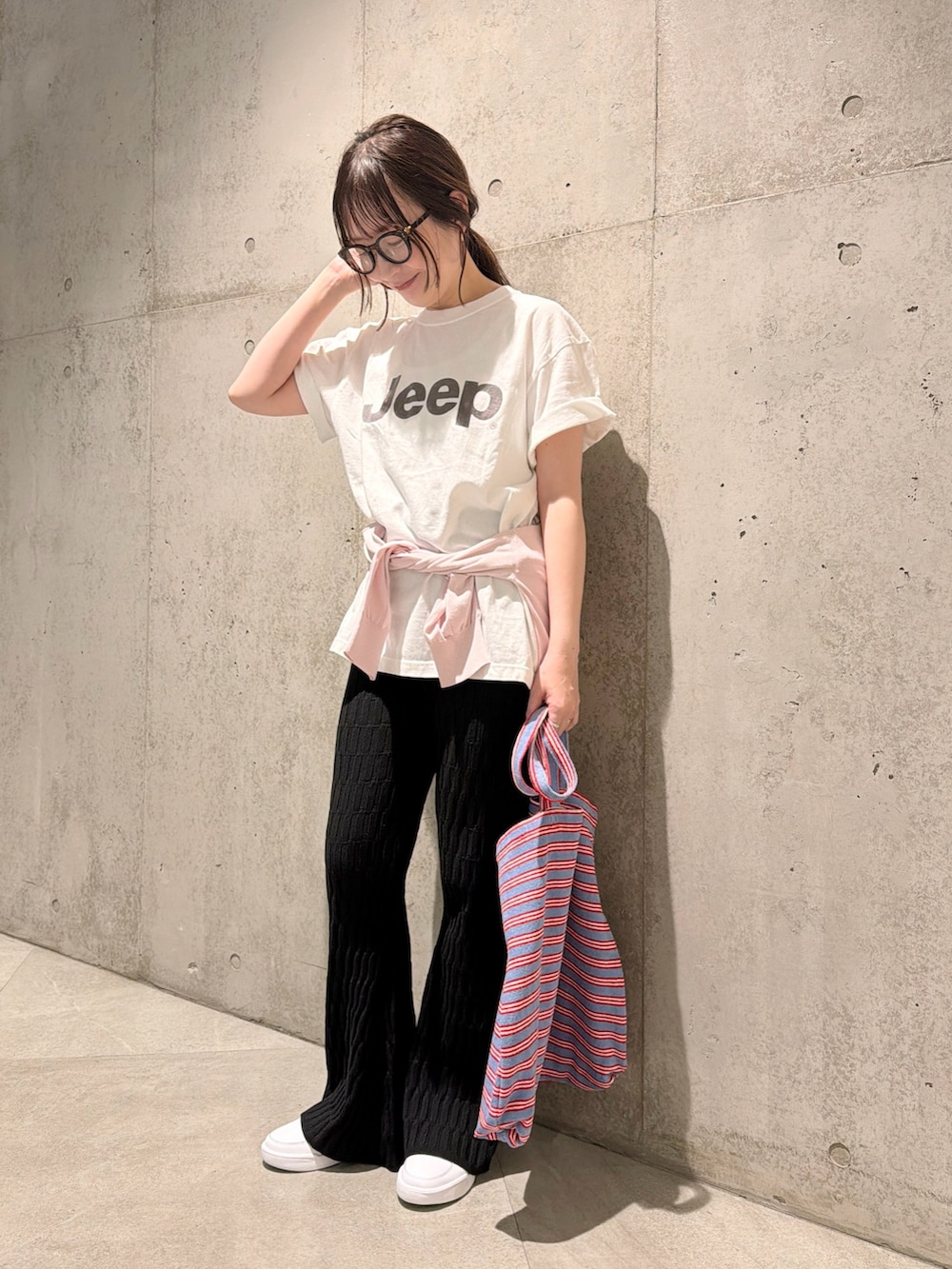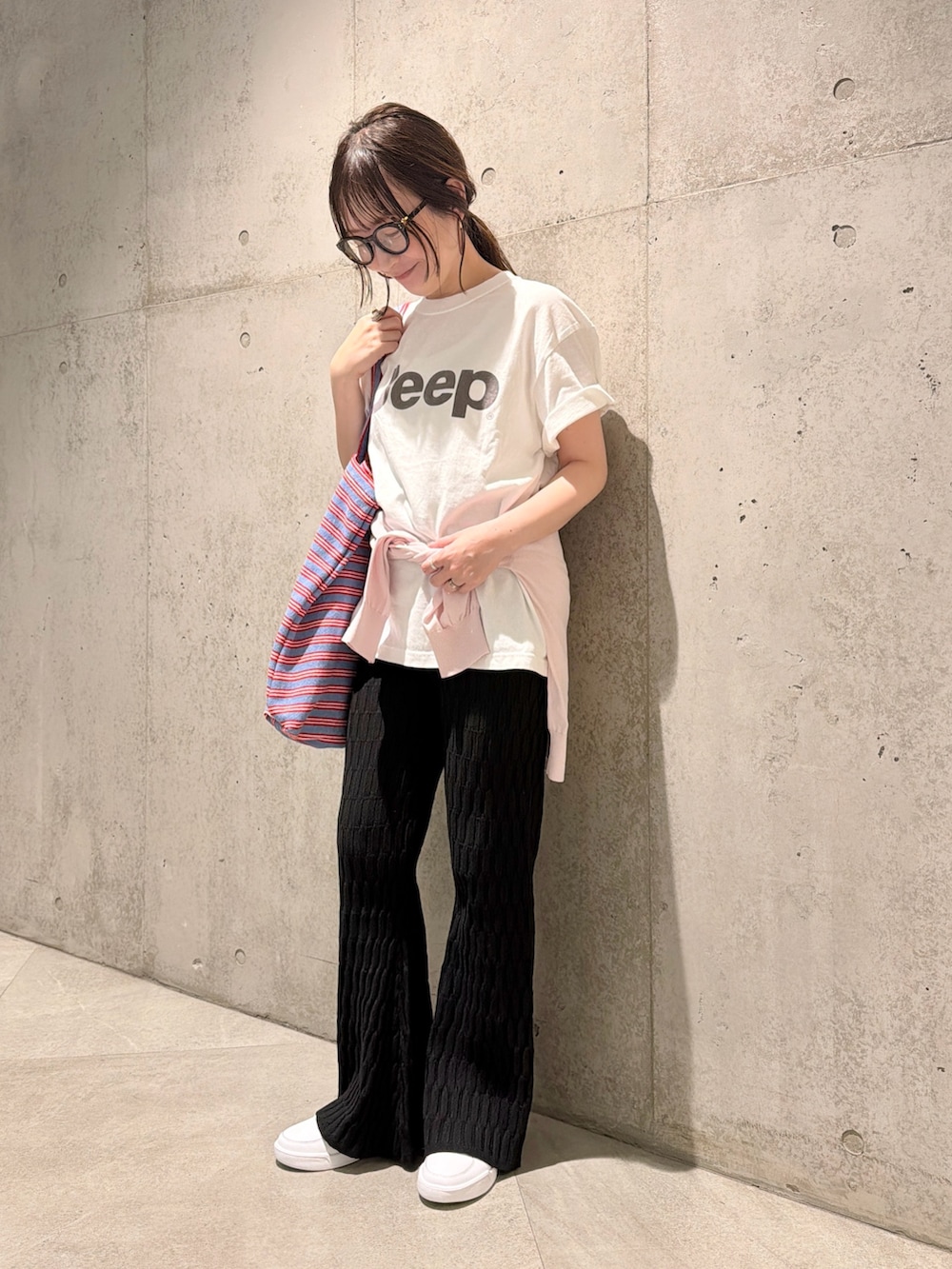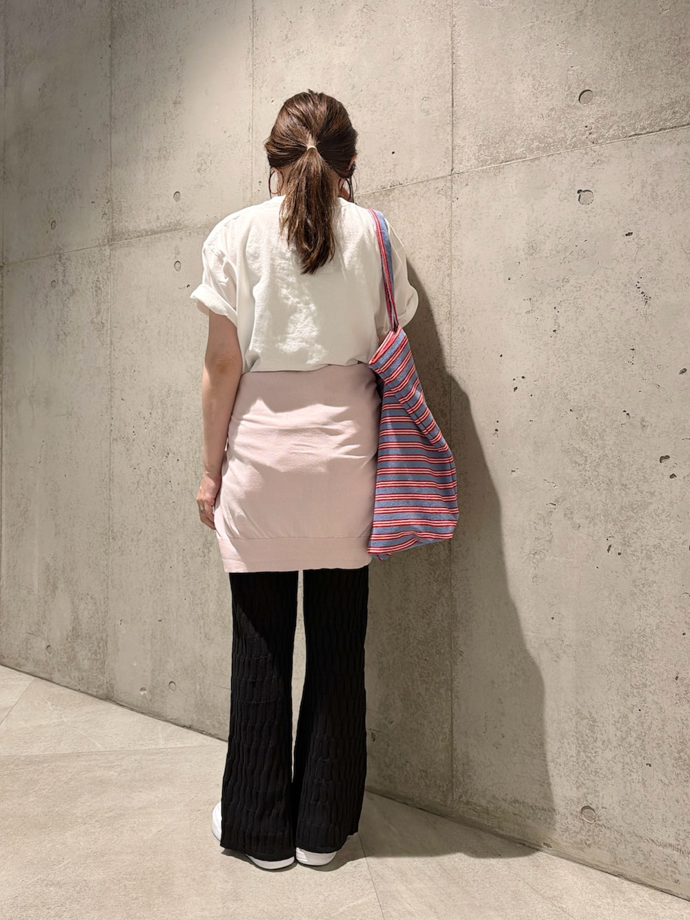 ストライプ柄のバッグと、ピンクのカーディガンを腰に巻いてアクセントに。