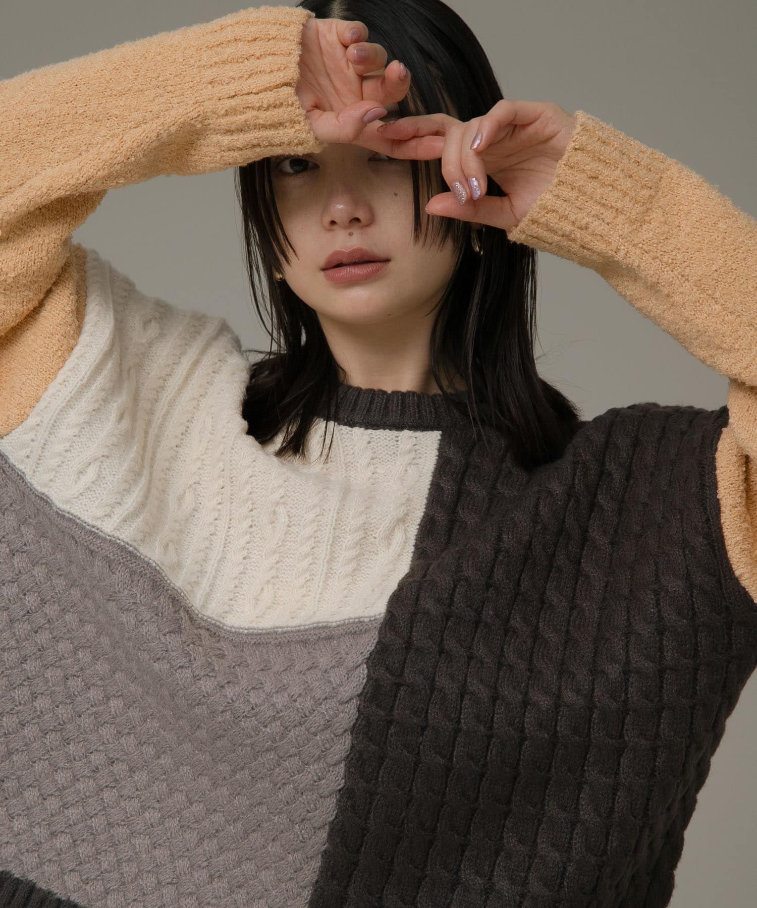 パッチワーク柄編みニットプルオーバー