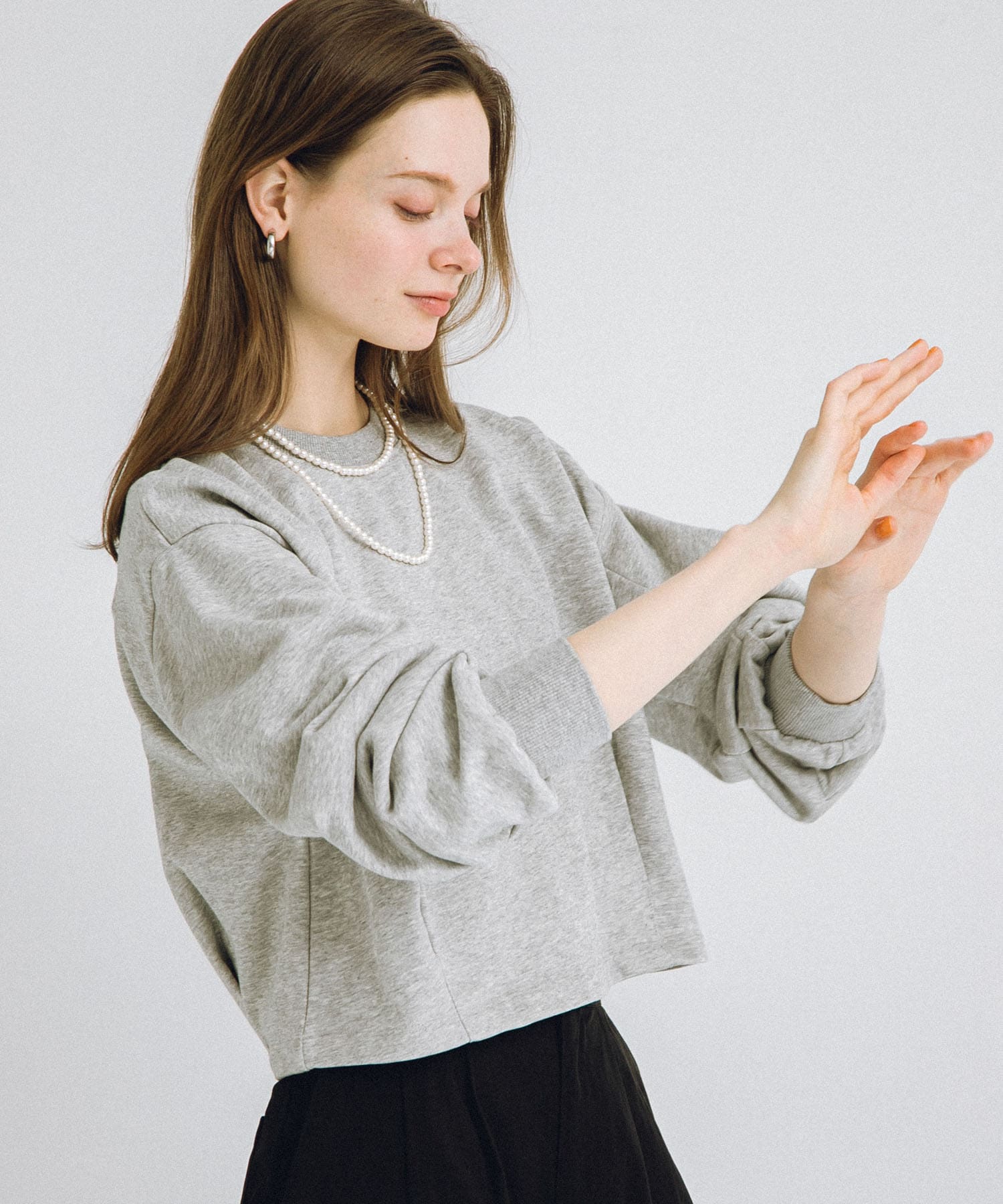 袖に切り替えとタックが施され、立体的なシルエットが特徴的なスウェットです。