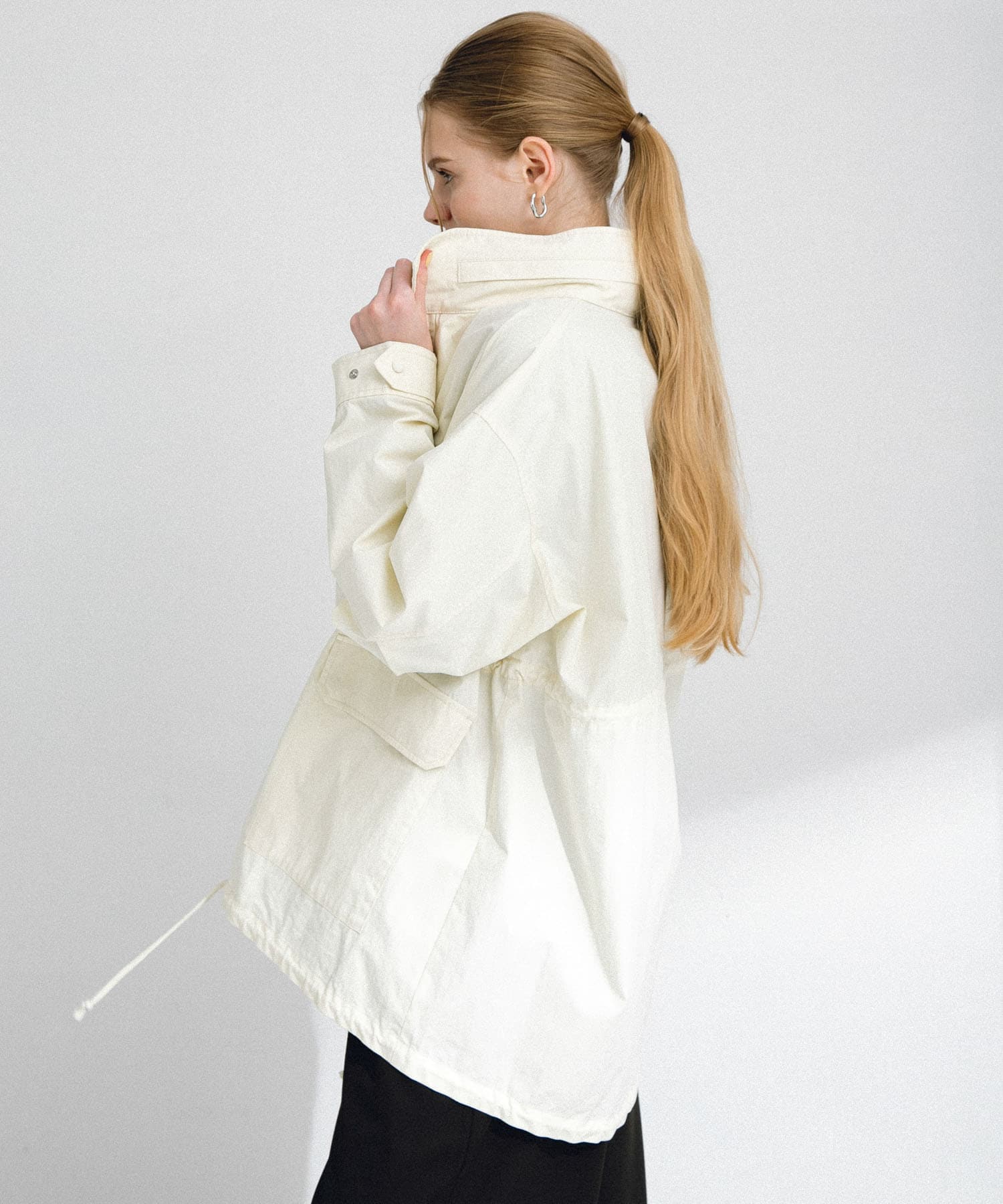 ヒップが隠れる着丈やオーバーなサイズ感、大きなフラップポケットがポイントです。