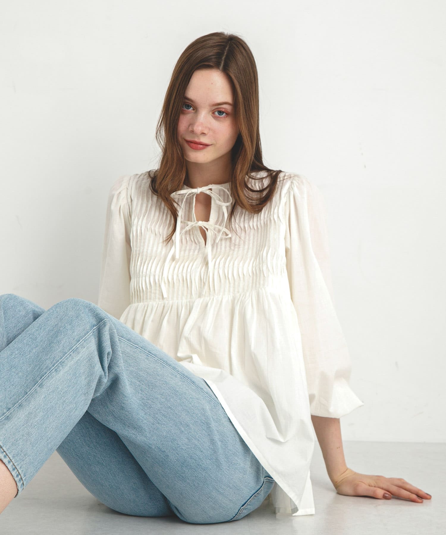 顔まわりの細やかなピンタックデザインに、胸下からふわりと広がるシルエットは、女性らしさを演出。
