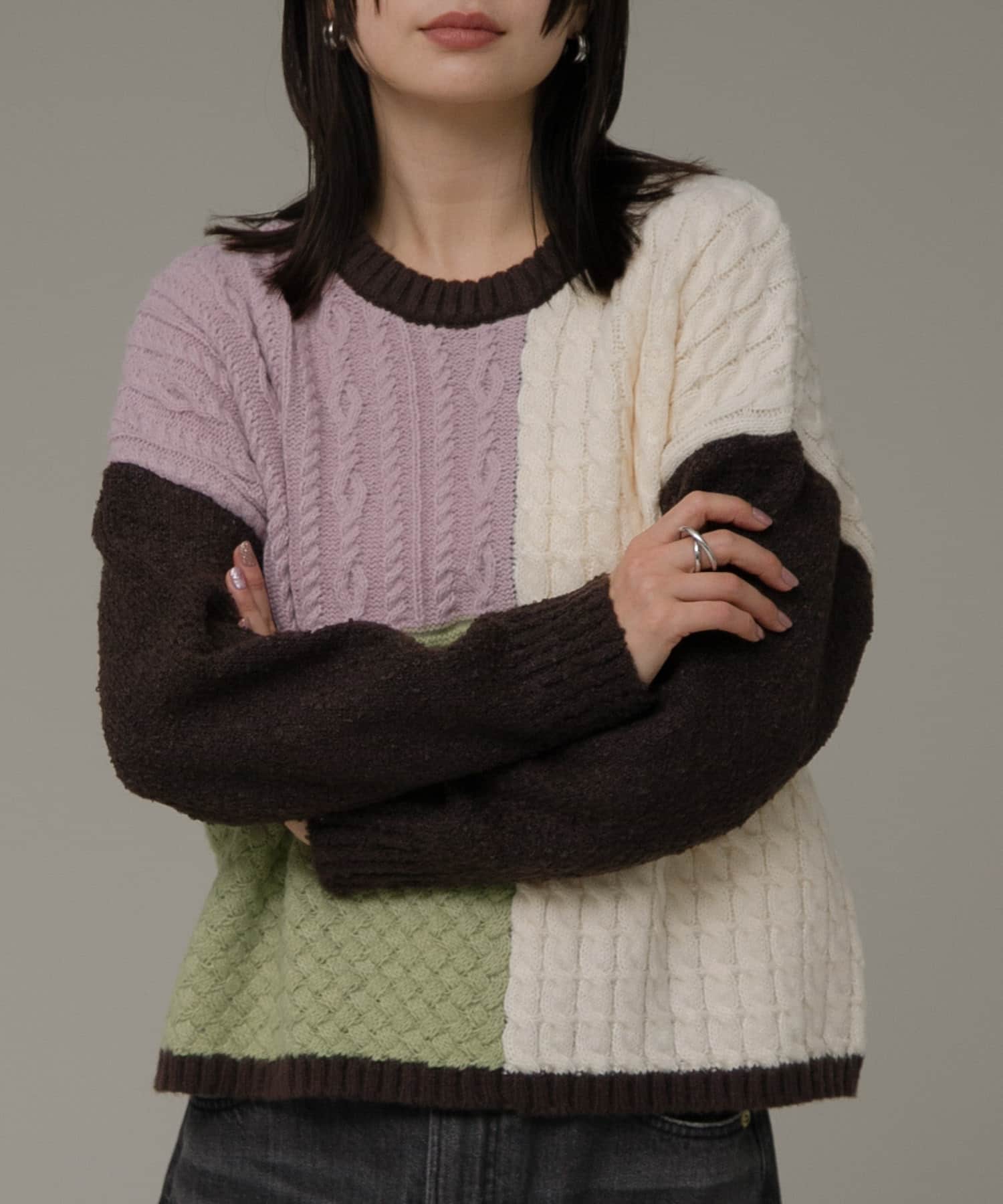 パッチワーク柄編みニットプルオーバー