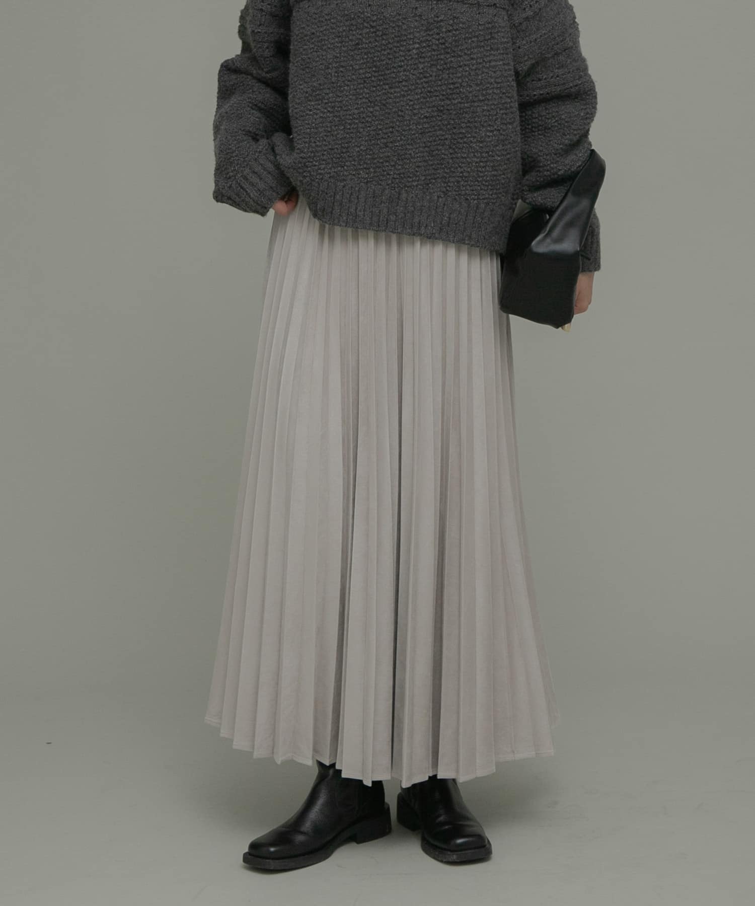 今回は、季節感の出るスウェード調のプリーツスカートを合わせてみました。