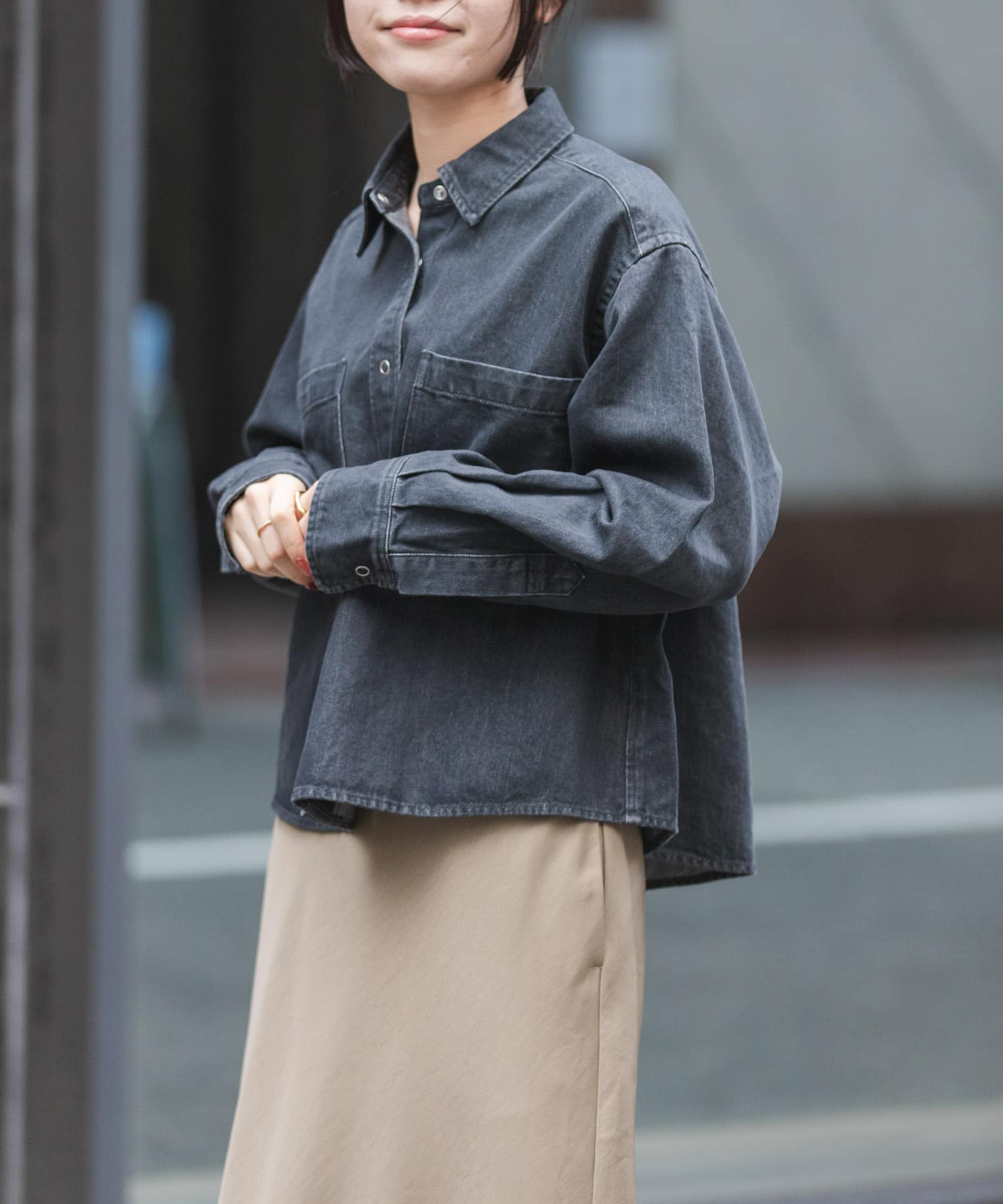 スナップボタンに、着丈をすっきりと短めにすることで、スタイルアップとボトムスとの相性が良いアイテムです。