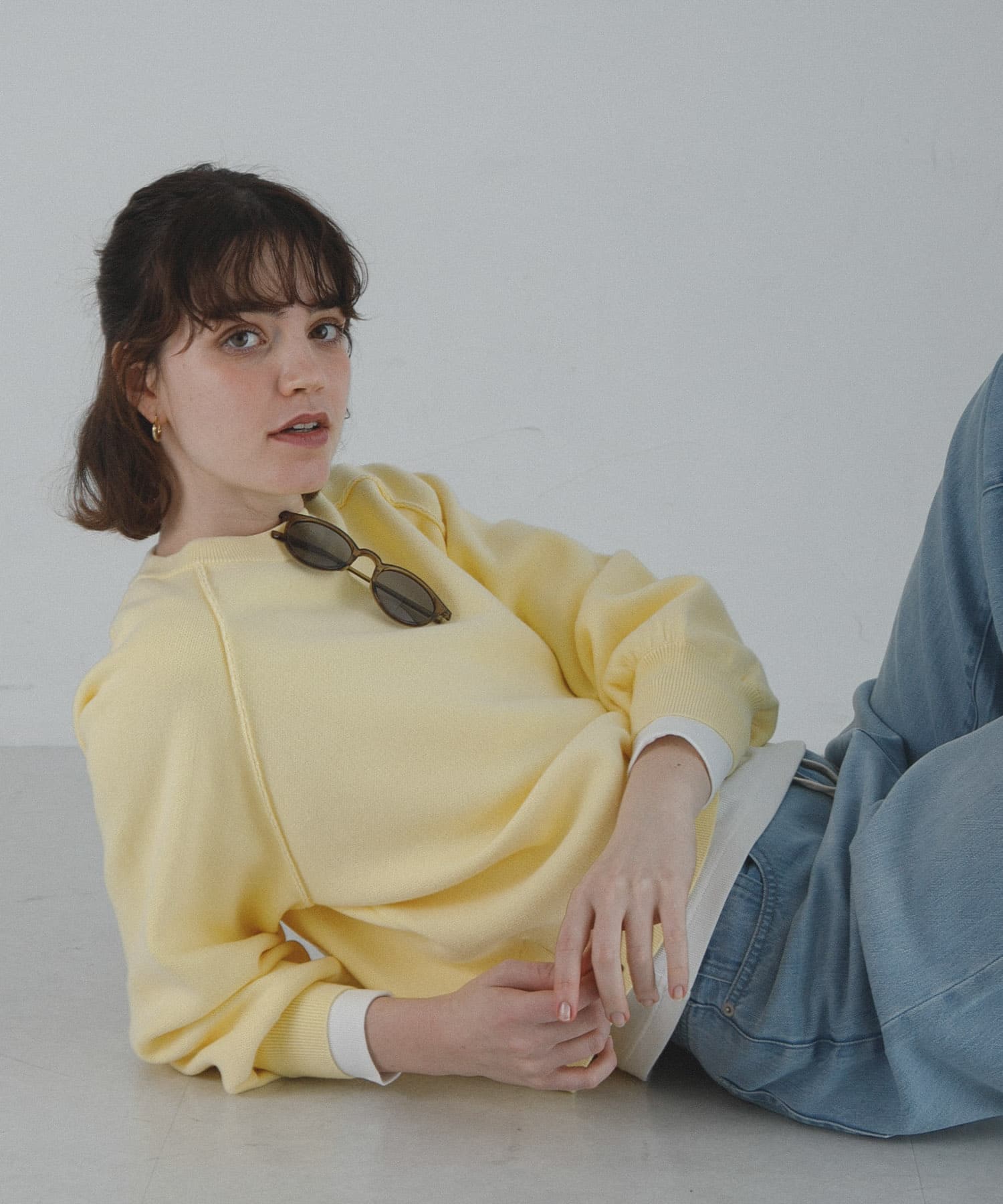 今回は、春らしい淡色でまとめて、イエローカラーのニットで肩掛けアクセントにしてみました。
