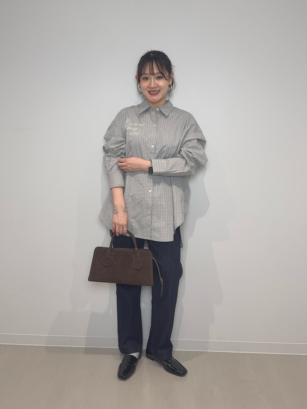 くすみカラーのチェック柄が程よいアクセントになって可愛いです💕胸元には刺繍デザインも◎