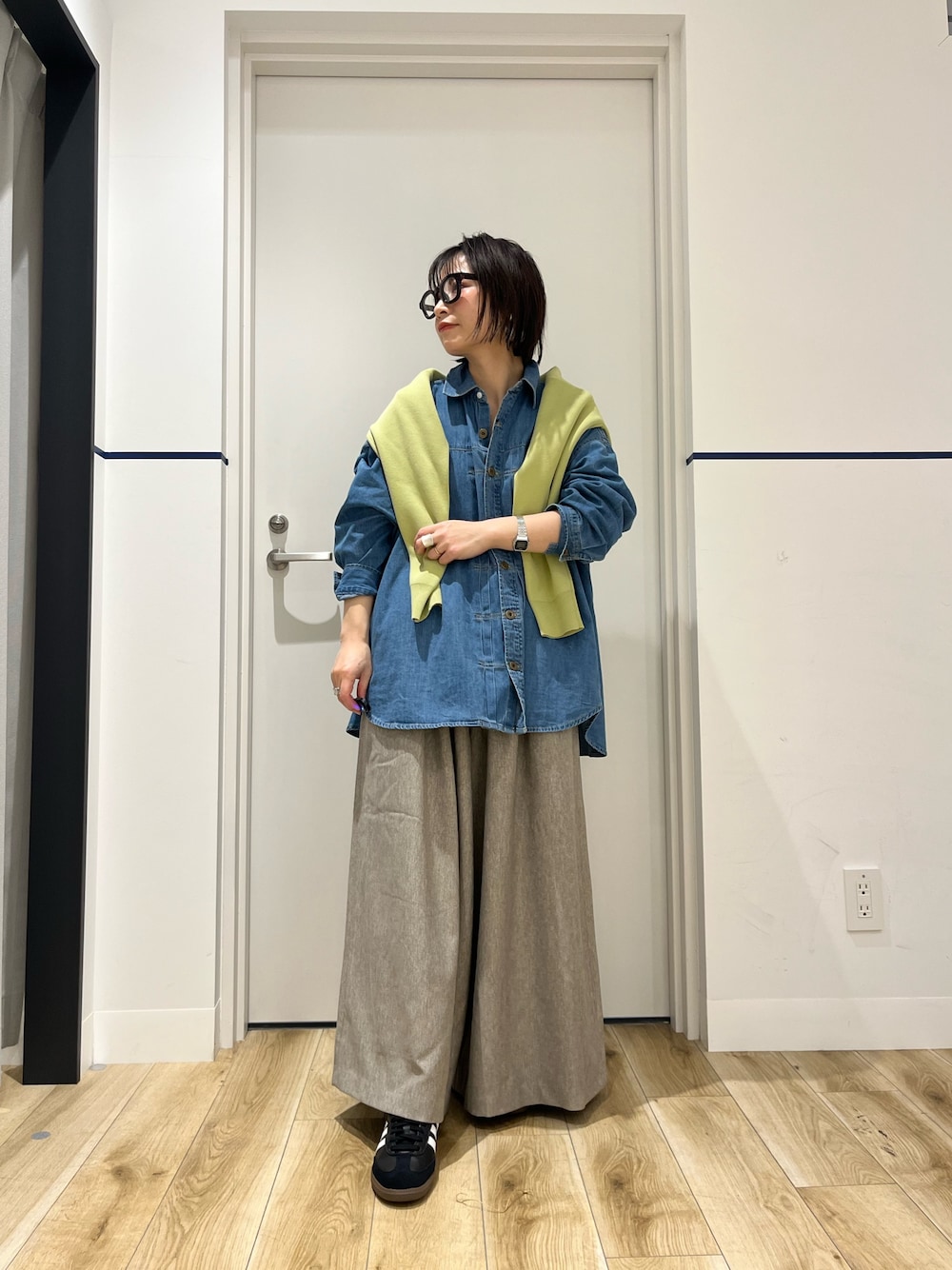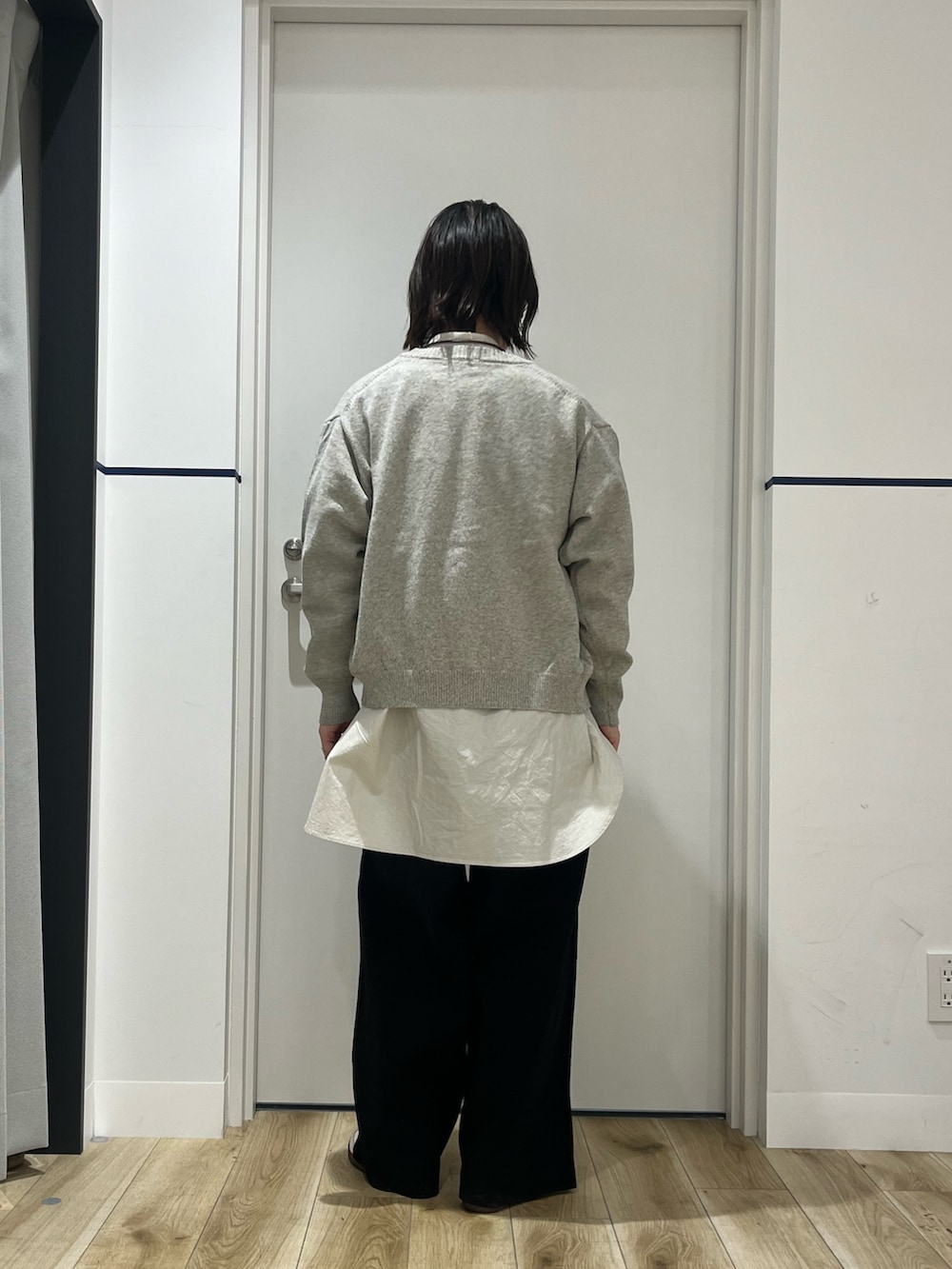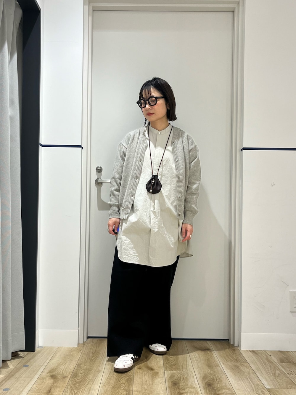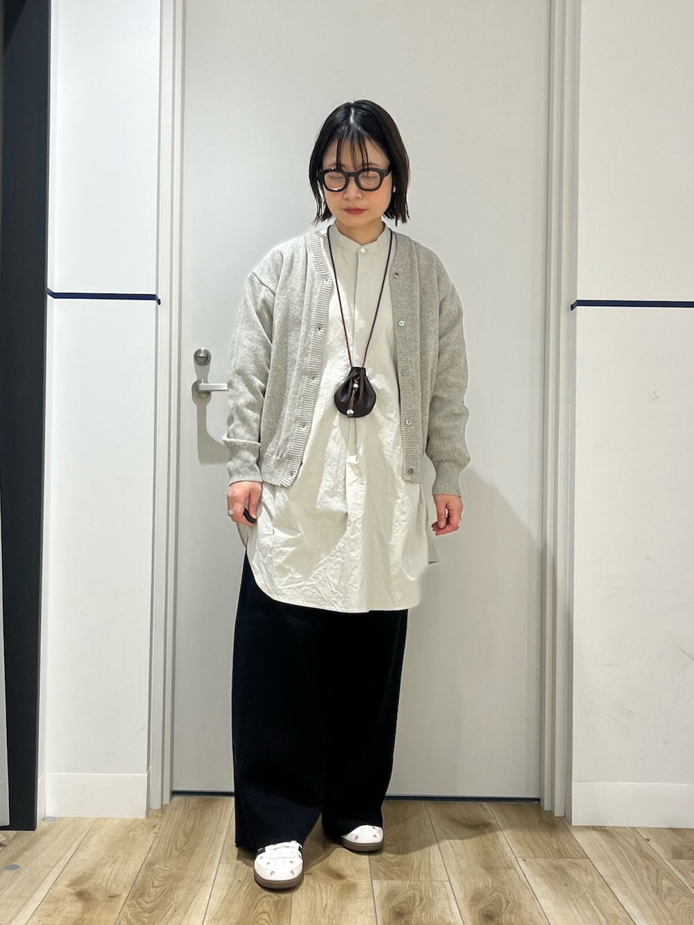 かぐれのドライコットンVネックカーディガンをチュニック丈のシャツに合わせたコーディネートです。コットンのカーディガンは