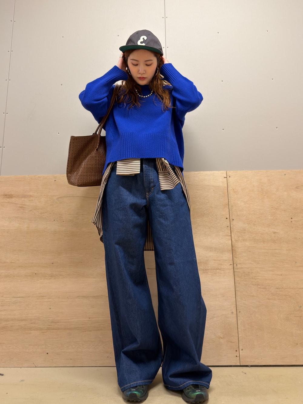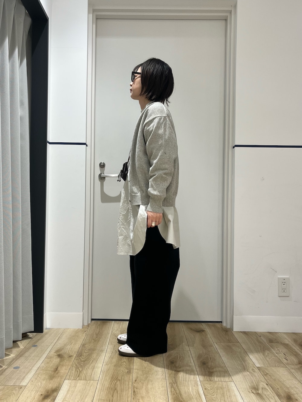 ボトムスもかぐれで、コットンカシミヤニットパンツを着用しました。