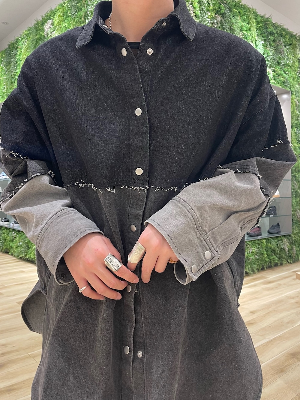 パッチワークBIGデニムシャツは切り替えパーツをグラデーションに仕上げたデザインがポイントでゆったりとしたサイズ感なのでアウター感覚で着用頂けますし、1枚できてもコーデにアクセントを出してくれるのでとてもオススメです︎︎👍🏻︎︎