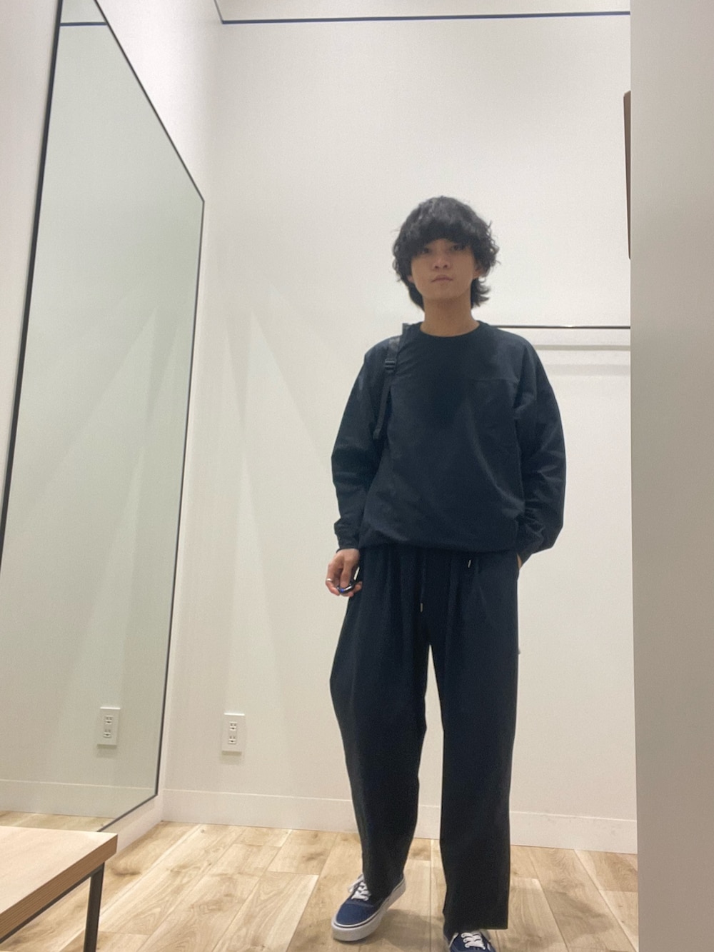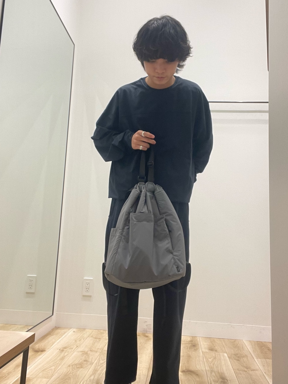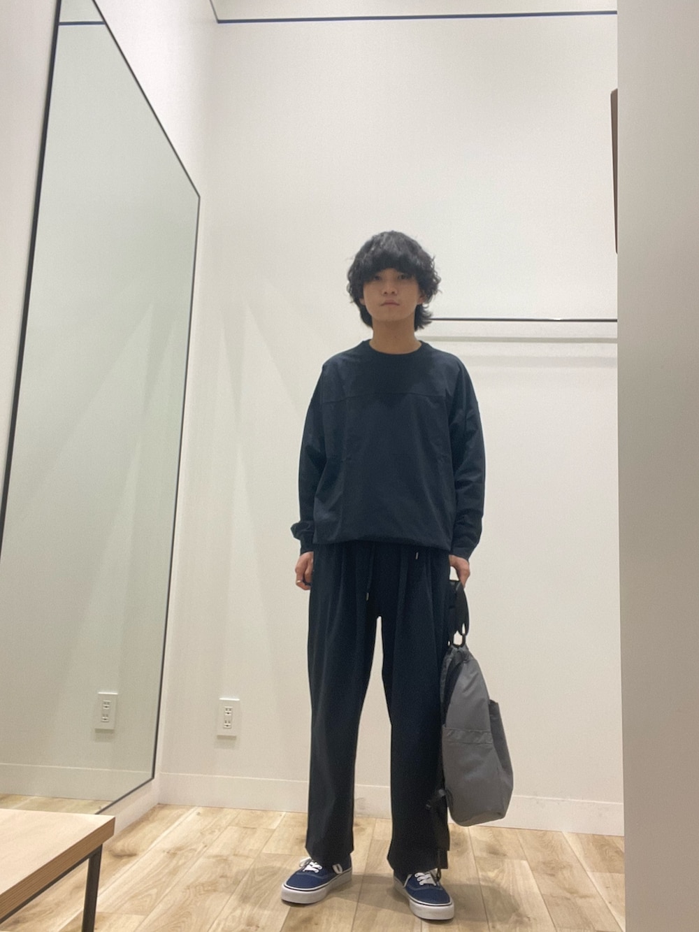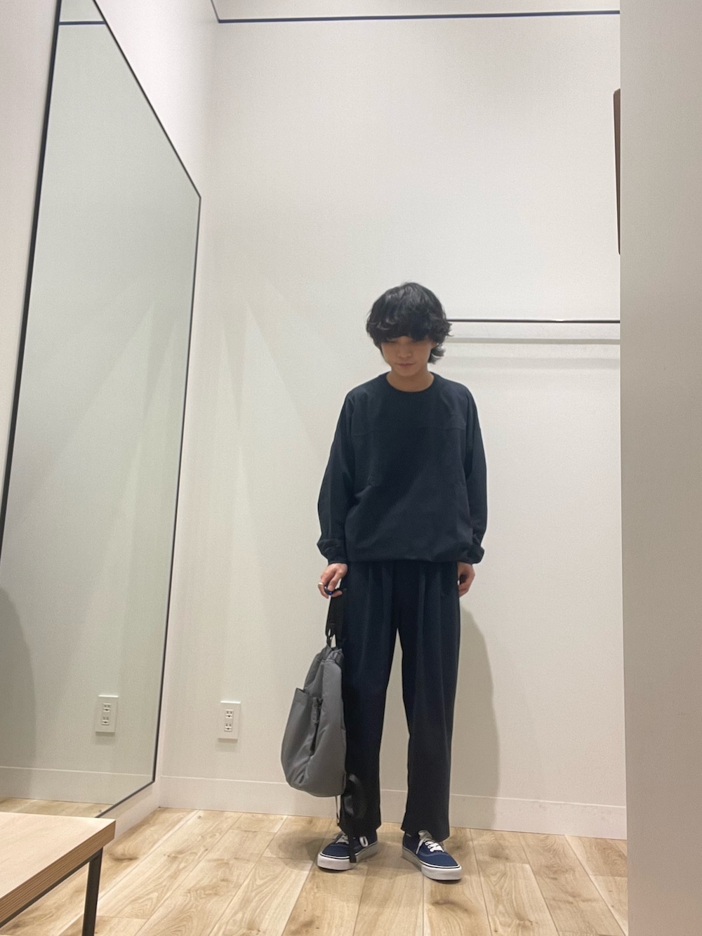 全体的にネイビーで固めたのですが、トーンが違うネイビーを合わせることでこなれ感を出しました!上下ともにストレッチや吸水速乾、アンチピリングが付いてるので、めちゃくちゃ着心地いいです!バッグもグレーで寒色で揃えたので雰囲気も出てかなりまとまったと思います。Wide Dadシリーズ、ぜひ店頭でお試しください!