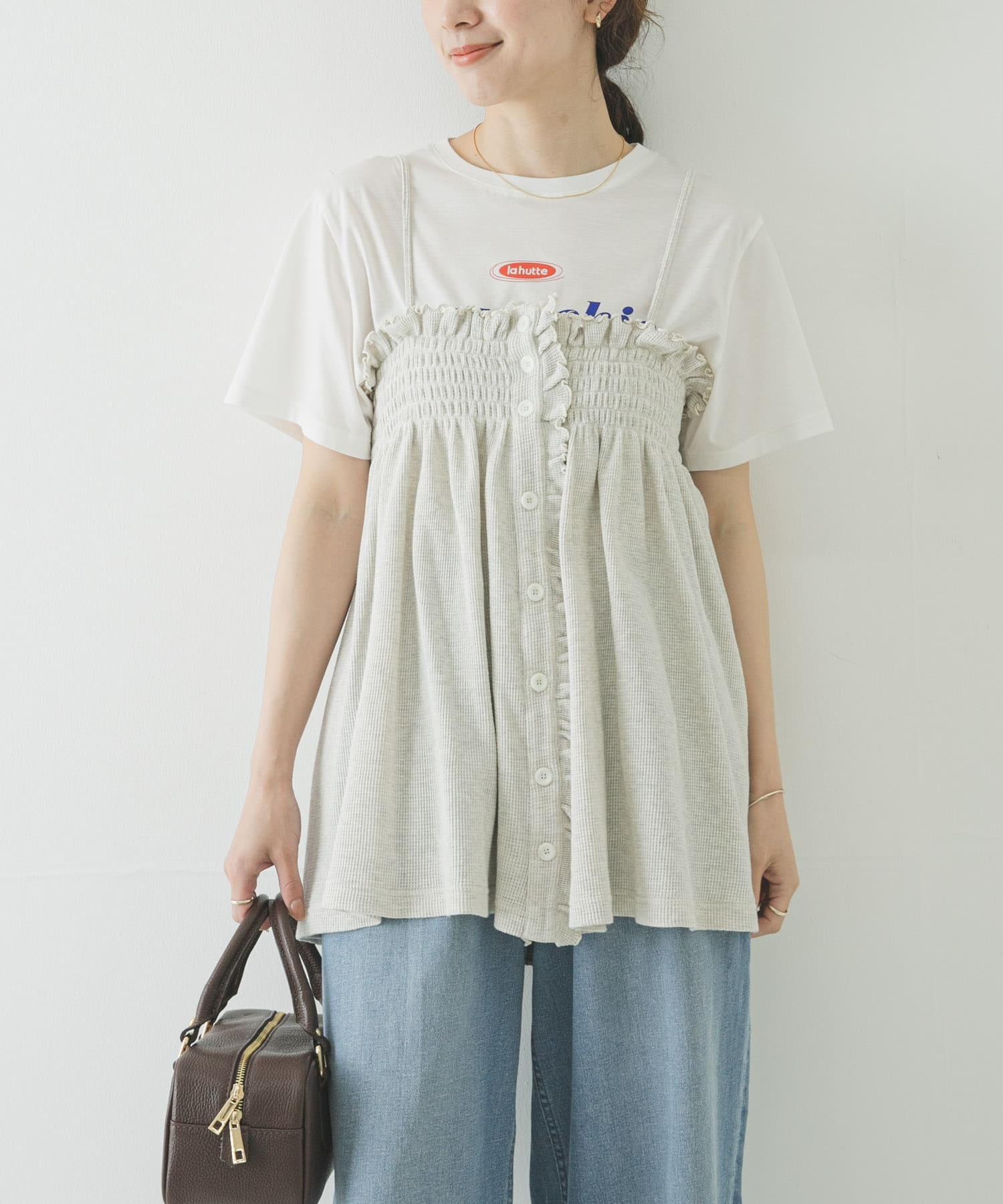 フロントに並んだ小ぶりのボタンと端々のフリルがカジュアルとガーリーのちょうどいい絶妙なバランス😫🤍