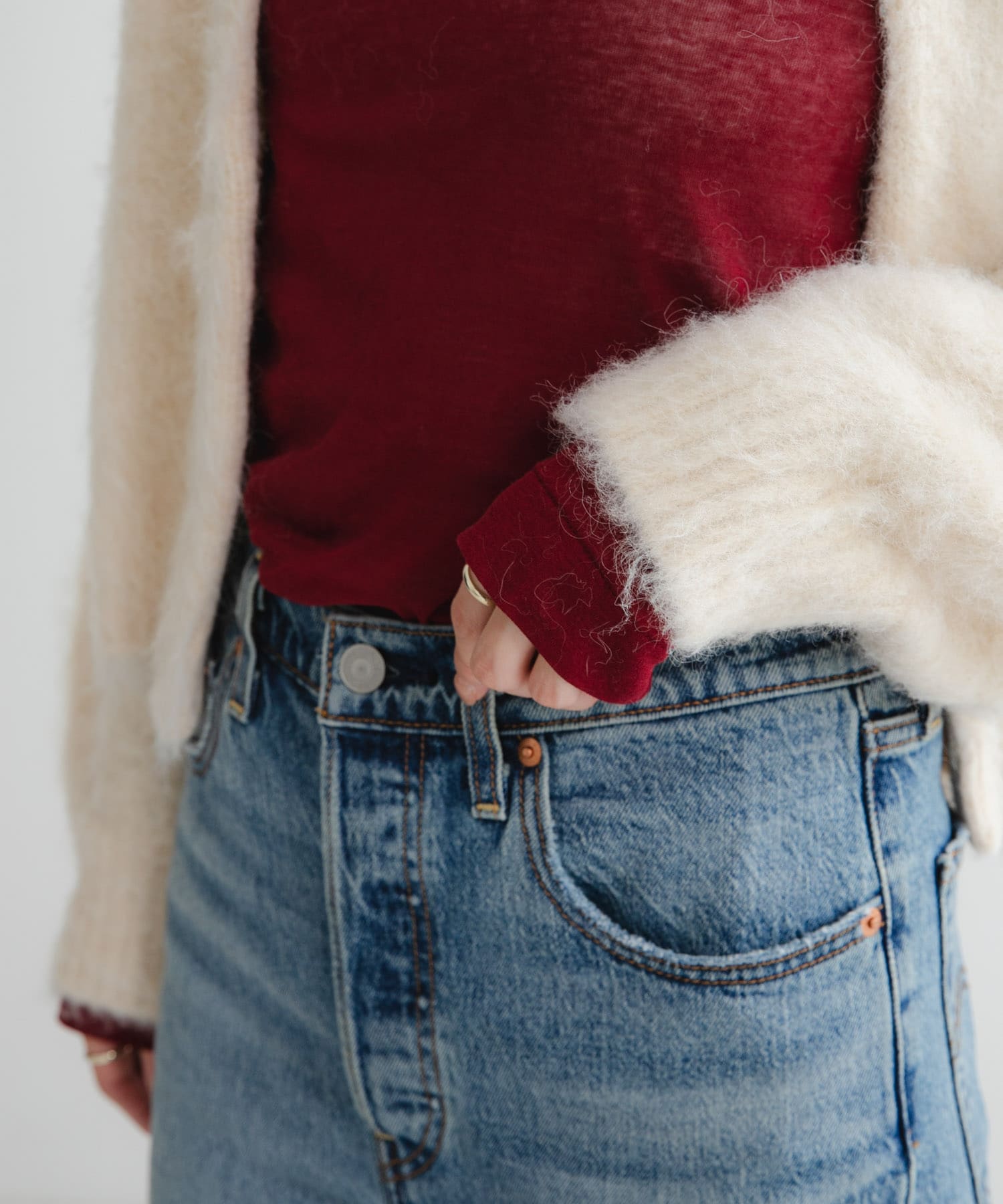 ニットとシアートップスはレイヤードできるので着回し効いて使いやすいです◎パンツはウエスト部分でワンロール折っています!