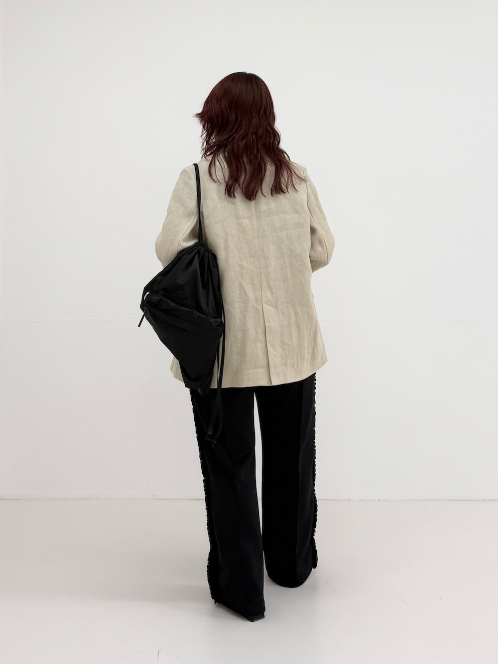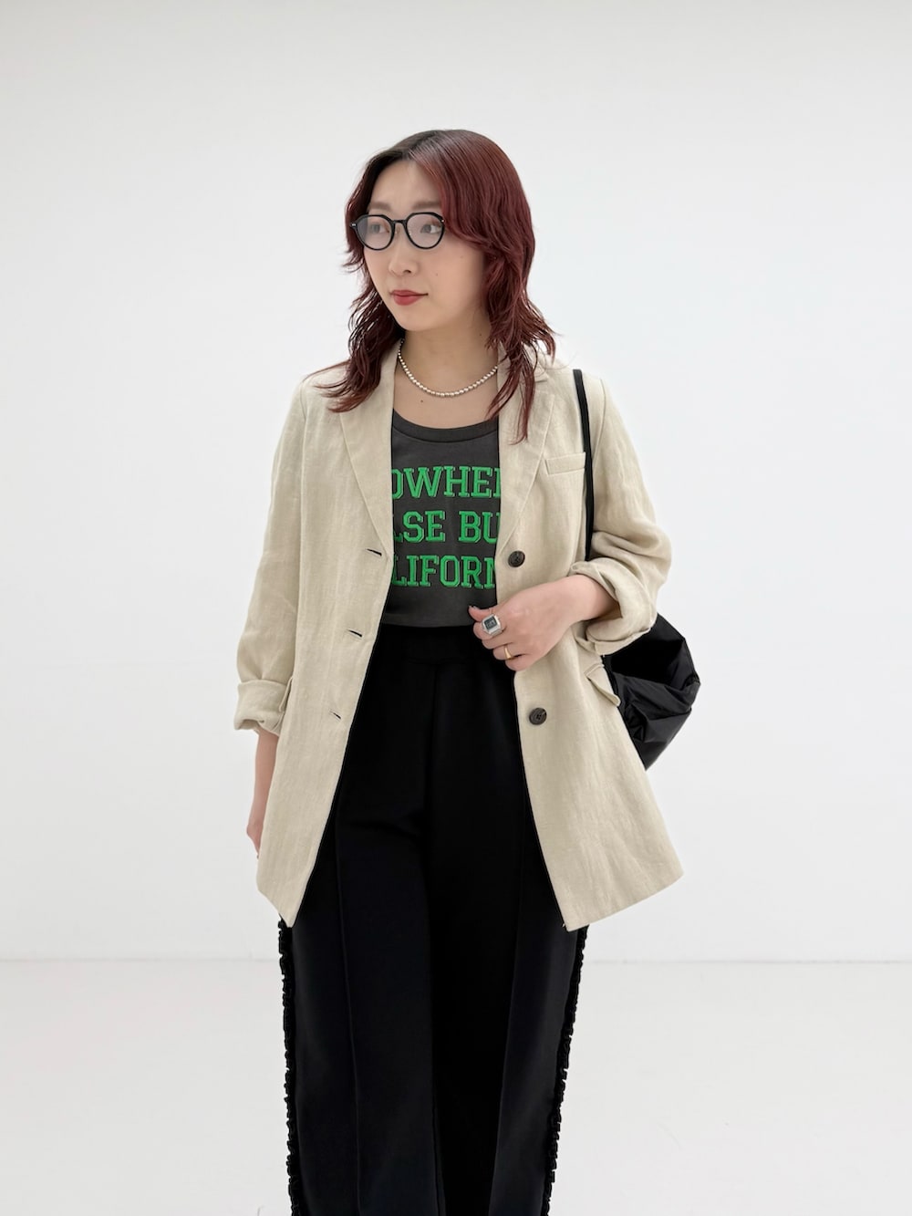 ジャケットが綺麗なデザインなので、あえてジャージ素材のパンツを合わせてラフに合わせてみました!