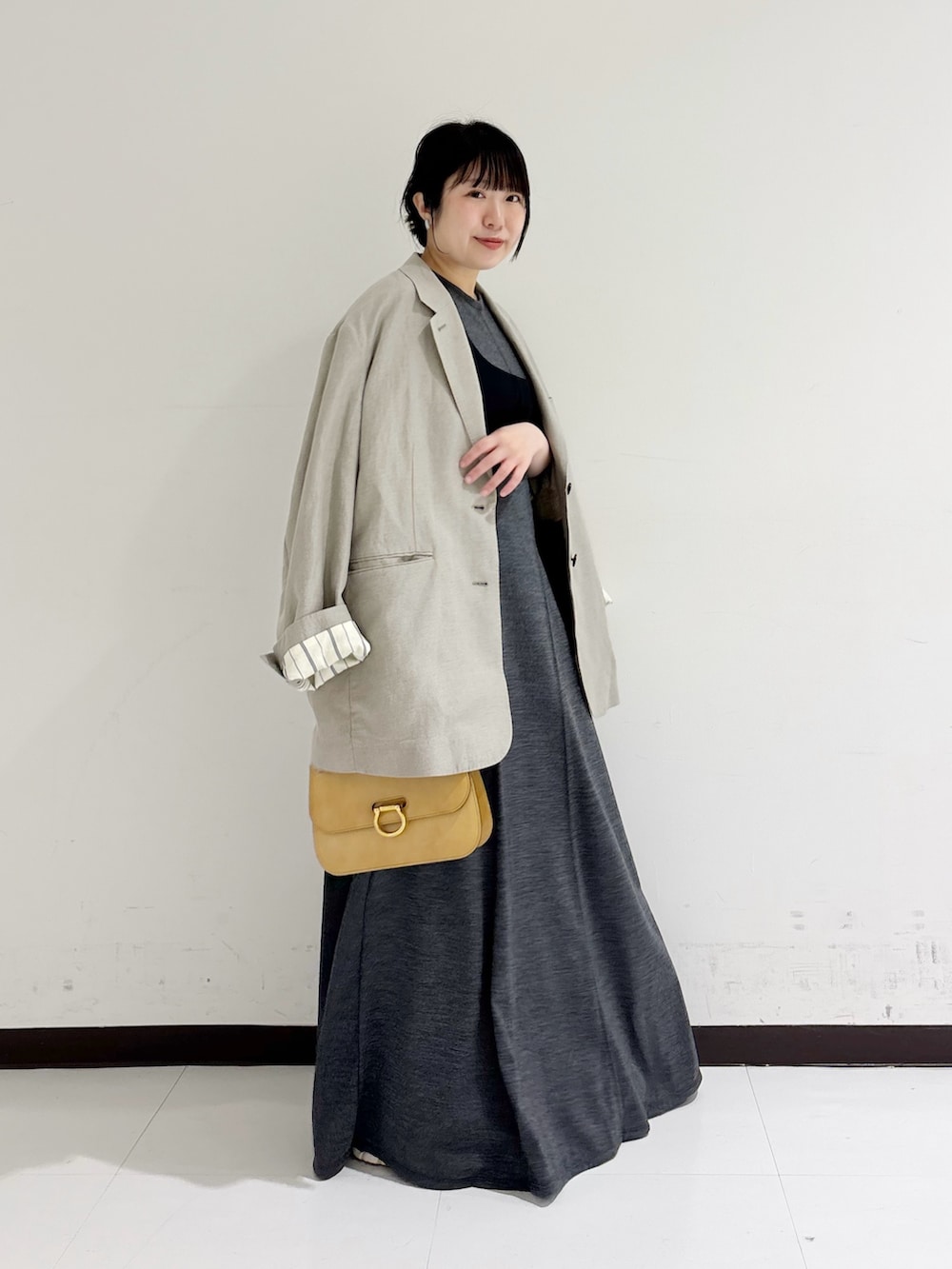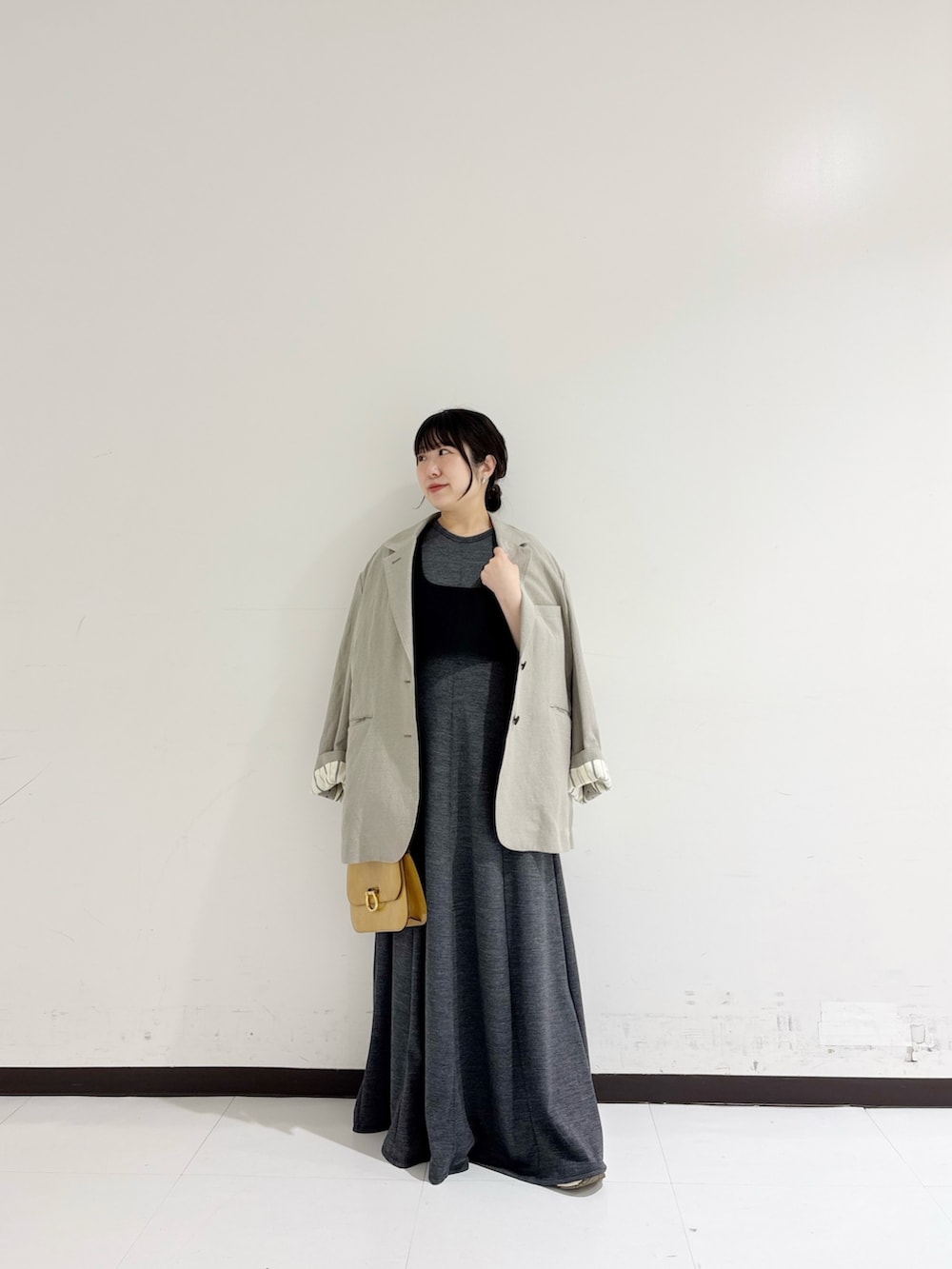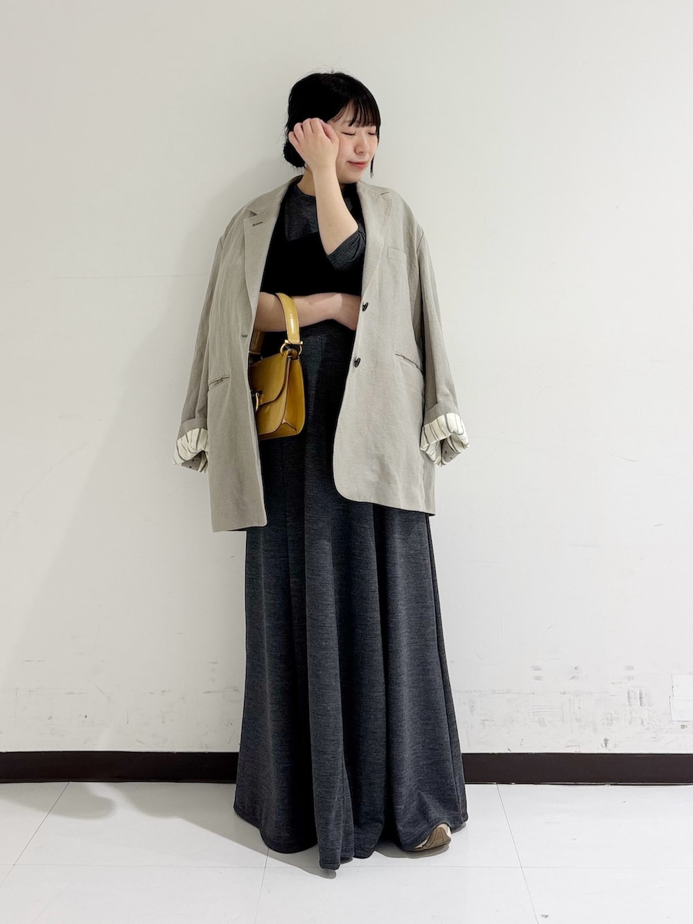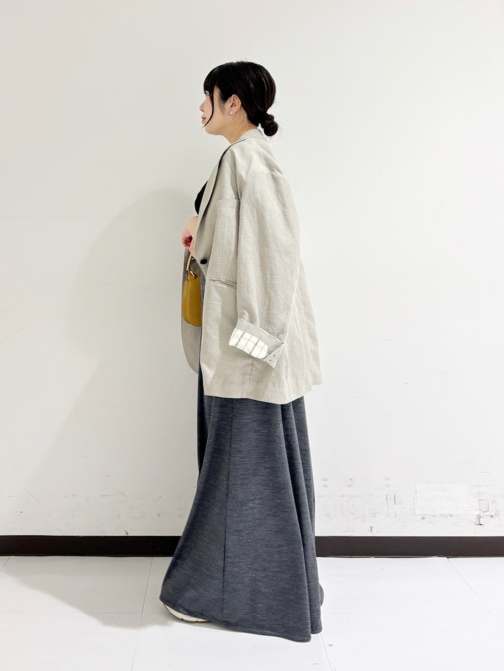 150cm前後の方はフラットシューズではなく、ボリュームスニーカーや高さのあるシューズで合わせていただくのをオススメいたします。