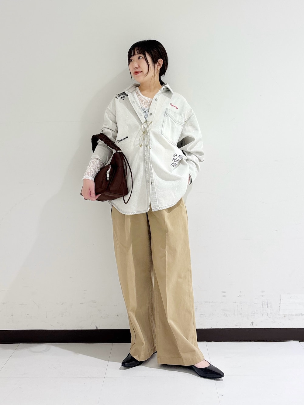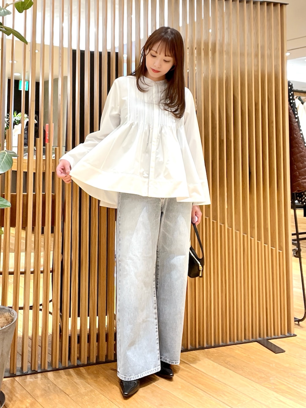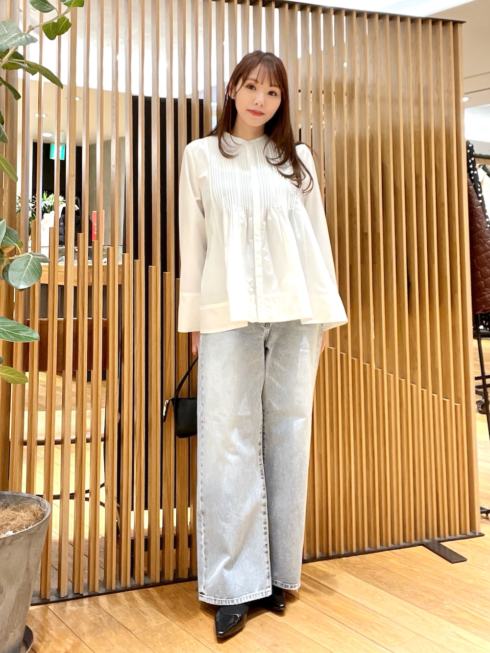 ふんわり可愛らしい印象なので、ボトムはストレートデニムやスラックスなど、すっきりしたシルエットを合わせるとバランス良くまとまります。
