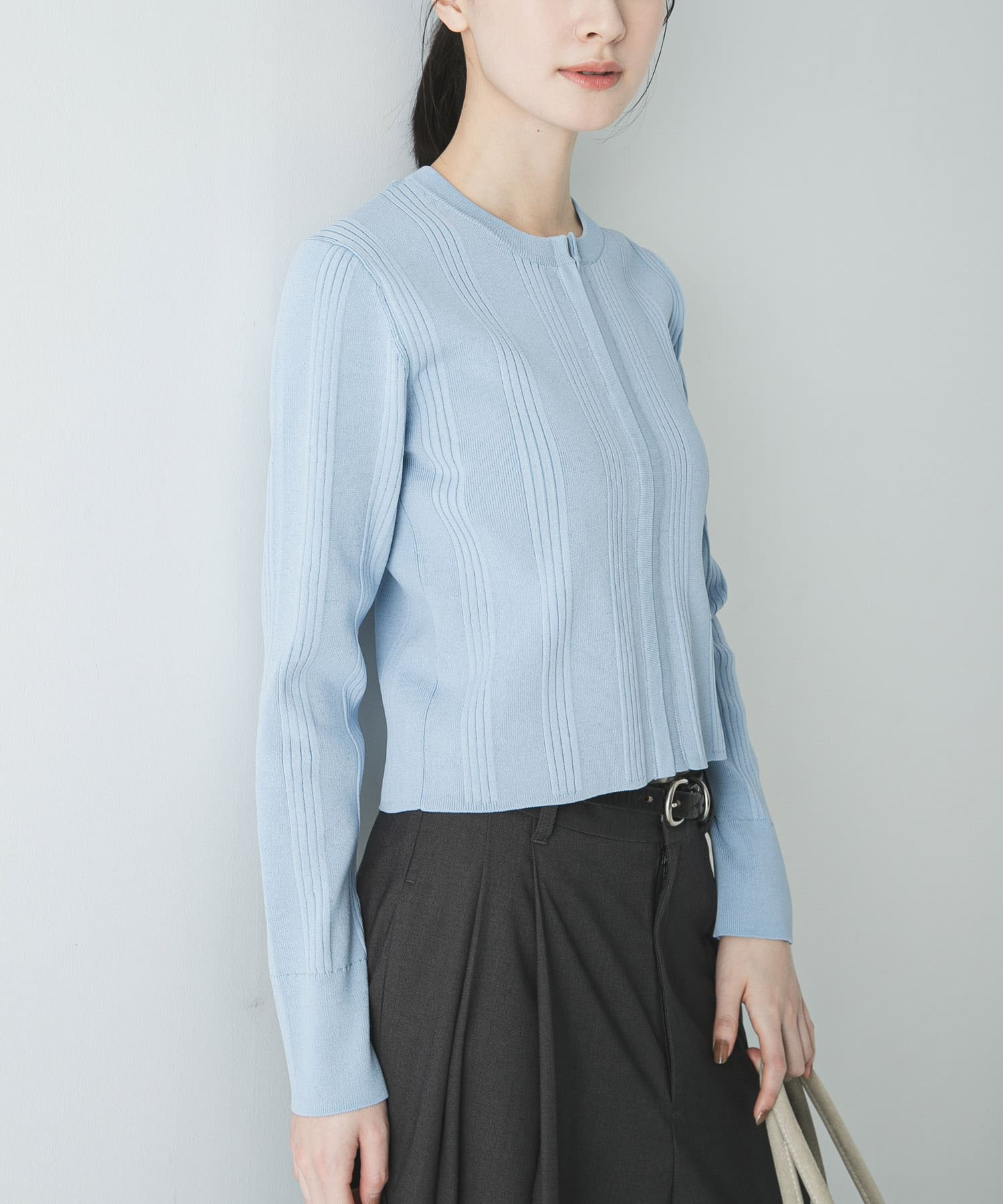 ランダムリブの縦ラインで、気になる上半身をすっきりほっそり見せてくれます◎