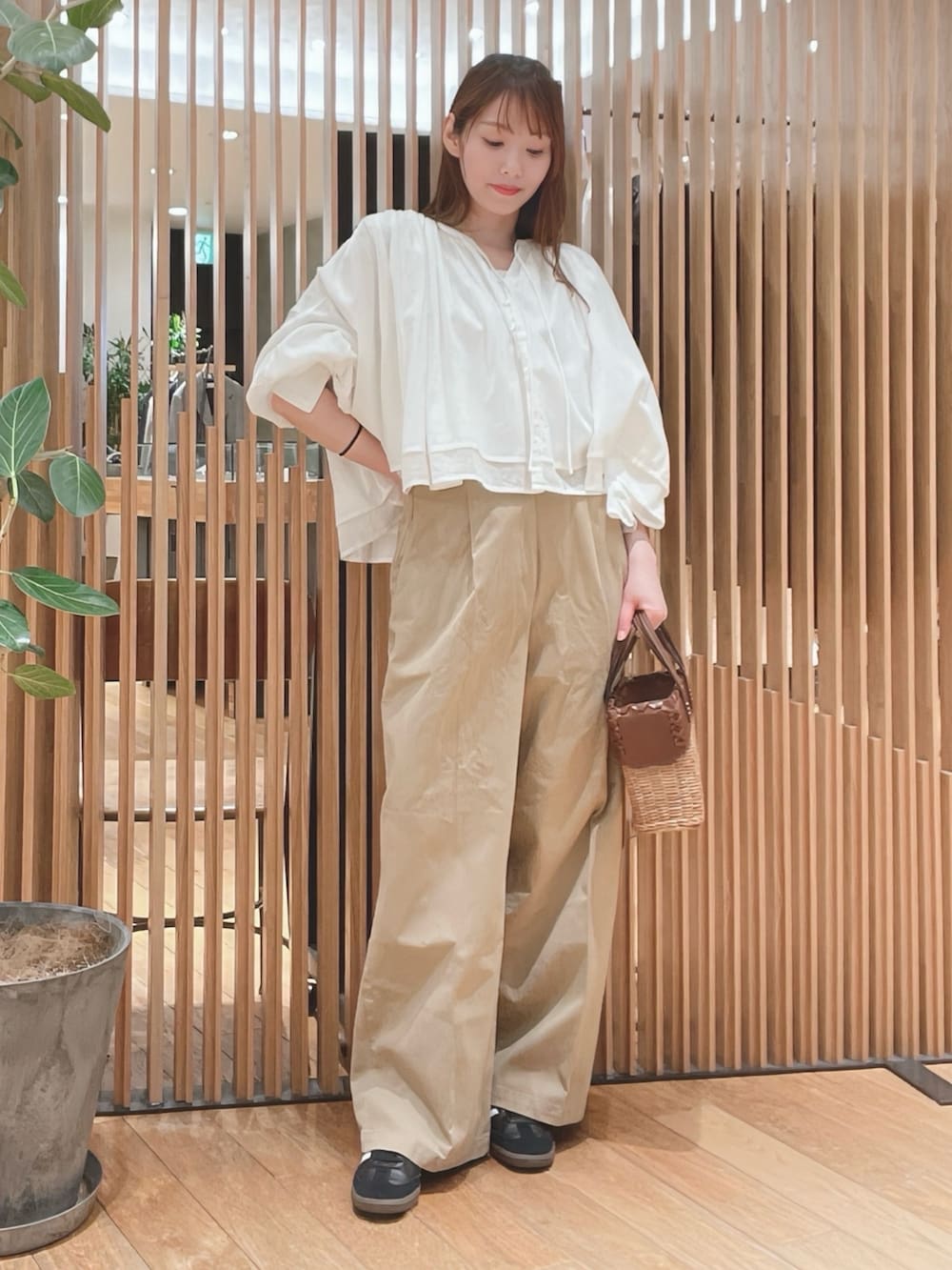 こちらは前開きタイプのブラウスで、一枚で着るのはもちろん、羽織りとしても使えるので暑くなってきても着れます!