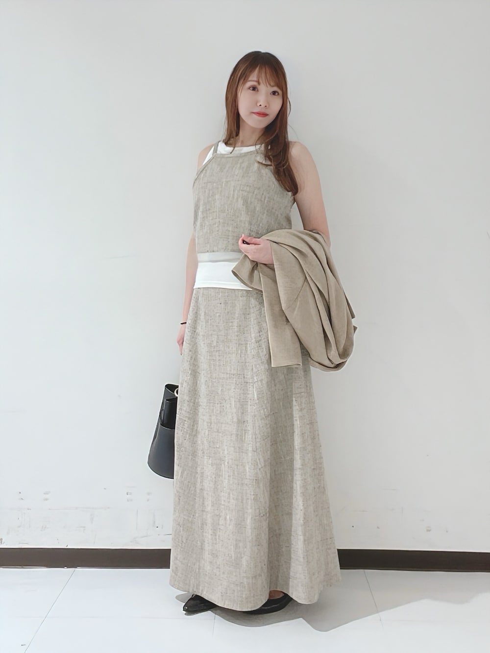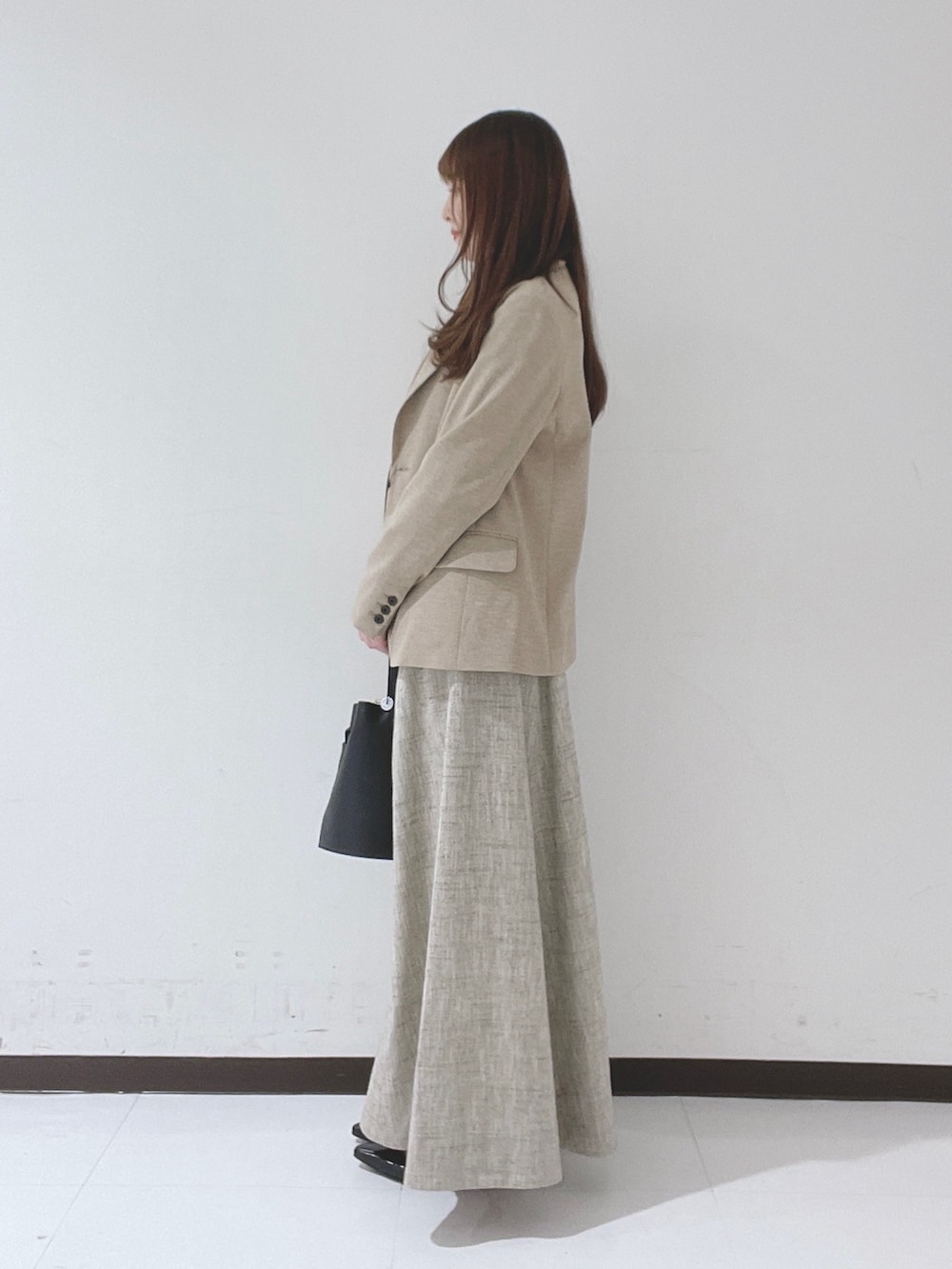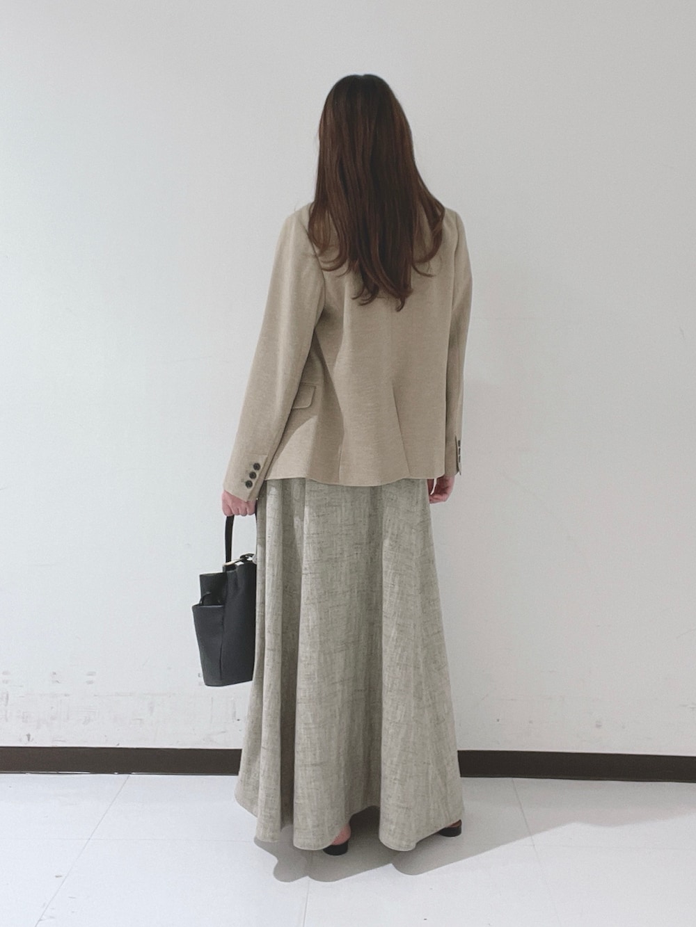 Aラインシルエットですが、腰まわりにタックが入っていないので広がりすぎず、すっきり見えするのがポイント。