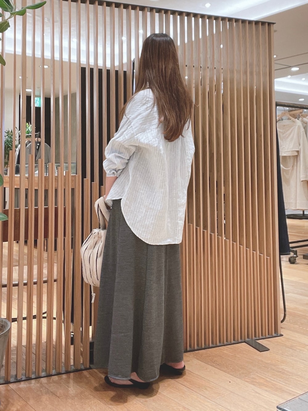 上半身はややフィット感があり、私の体型だとお腹まわりが気になったので、今回はシャツを羽織ってカバーしてみました。