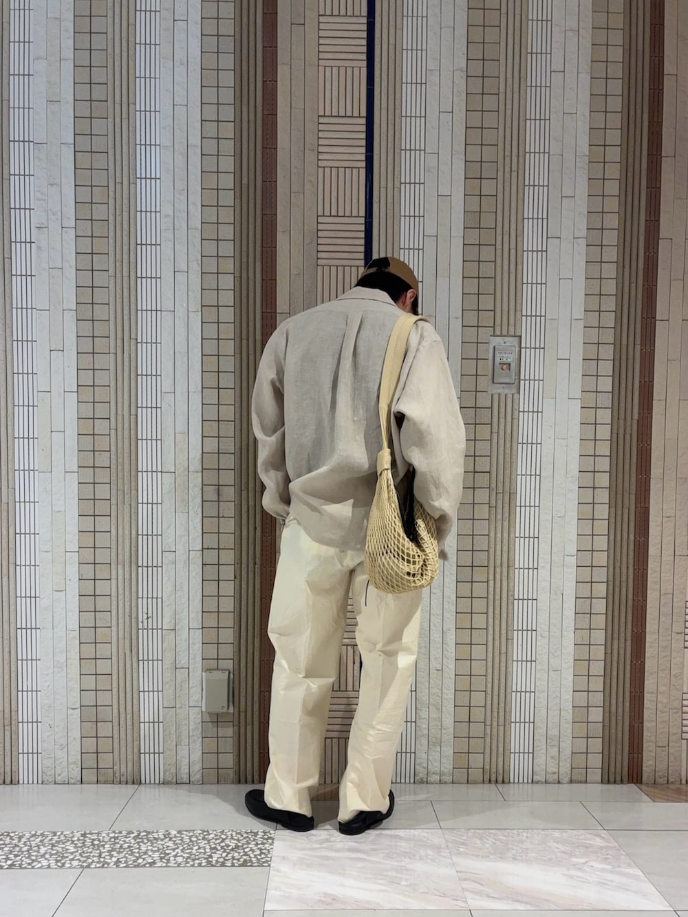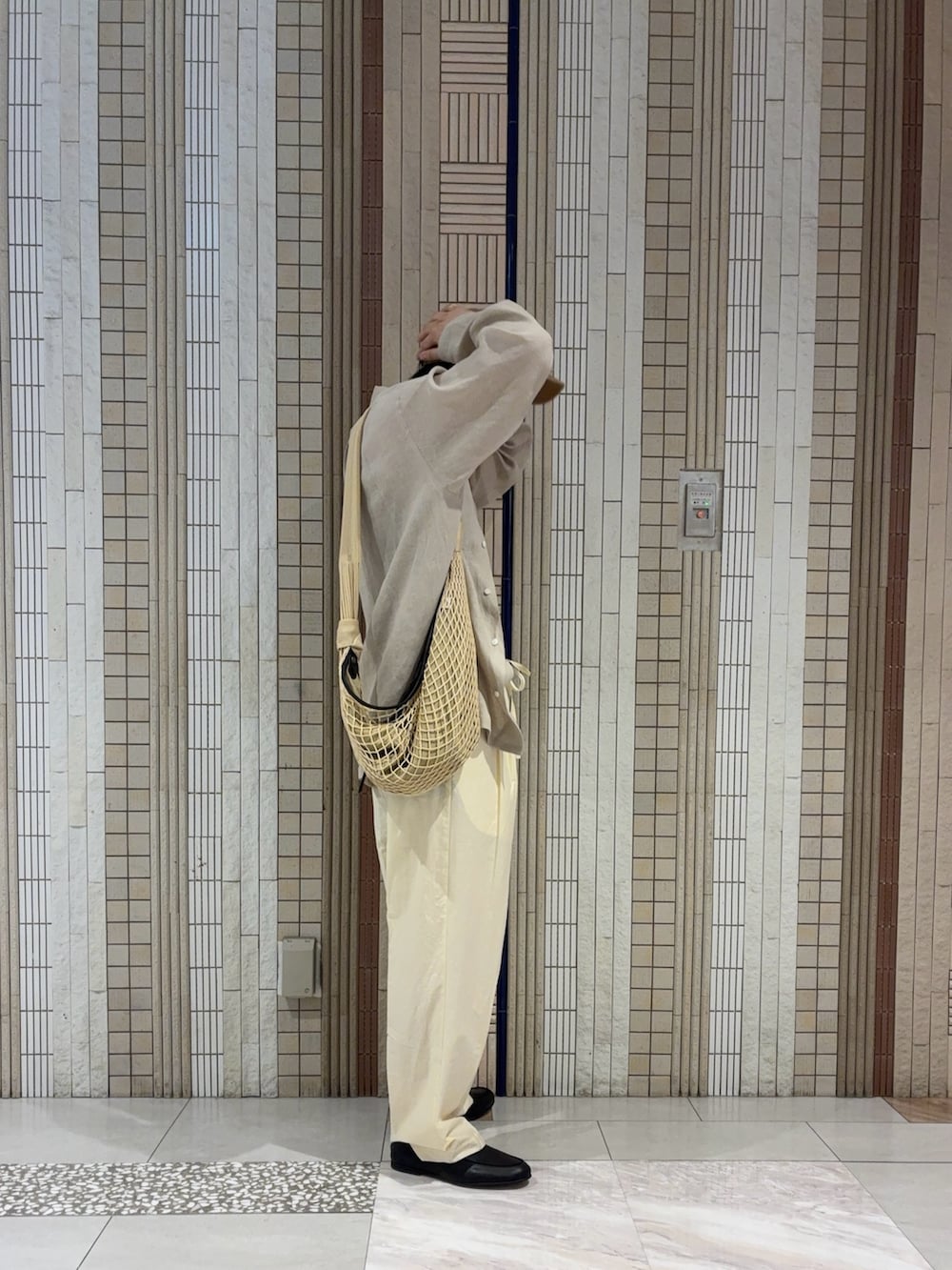 さて、こぼしたソースがえらく目につく配色です。何を食べるにしても気合いを入れねばなりません。快適さと引き換えに汚れに対して敏感さが必要となります。小春を超えた今楽しみたい同じトーンのスタイル。靴は踵を踏んで。