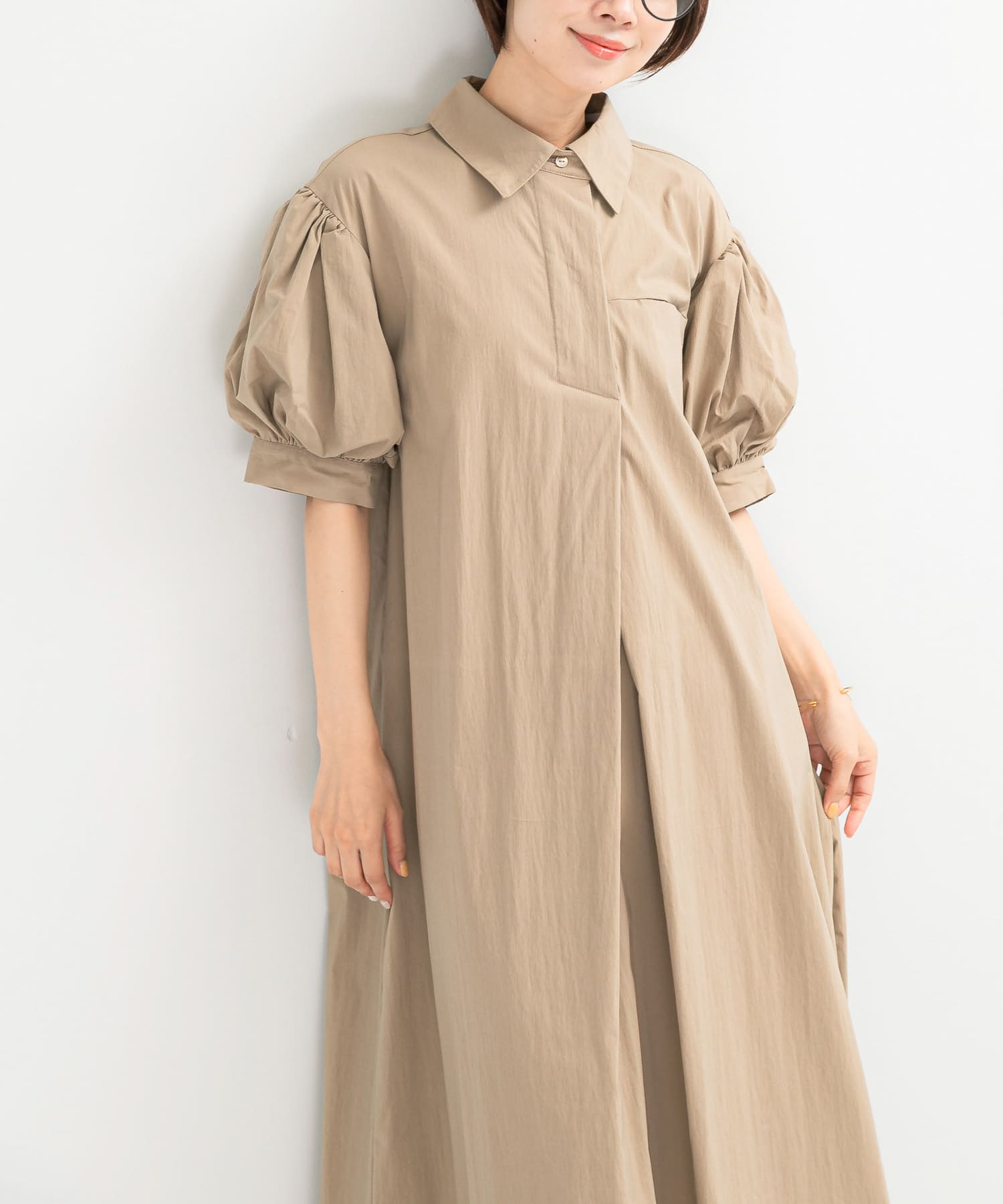 ボリュームたっぷりのパフスリーブが可愛いワンピースです。ベルトを合わせてウエストマークしても◎
