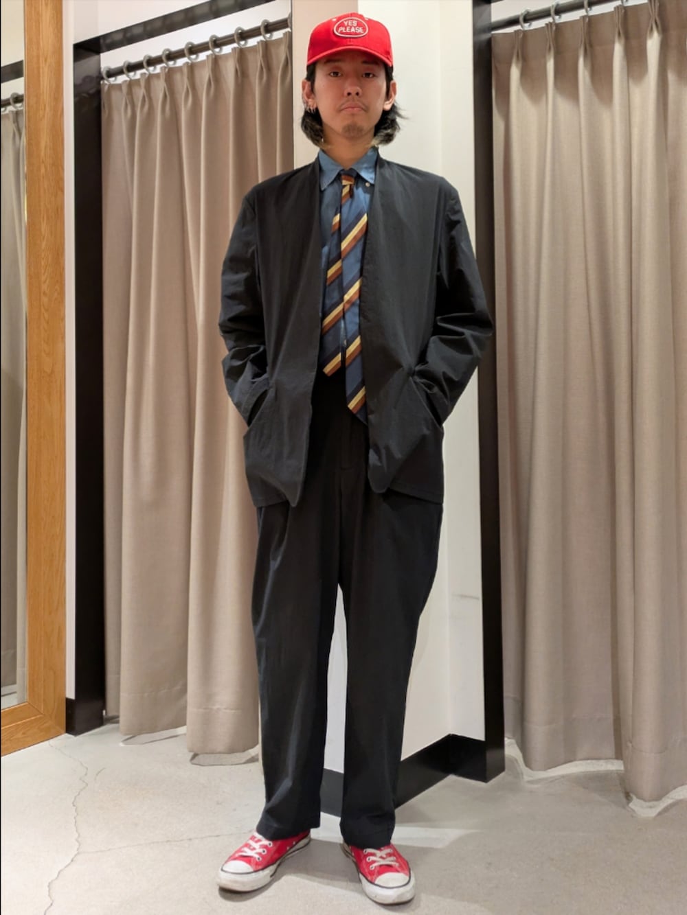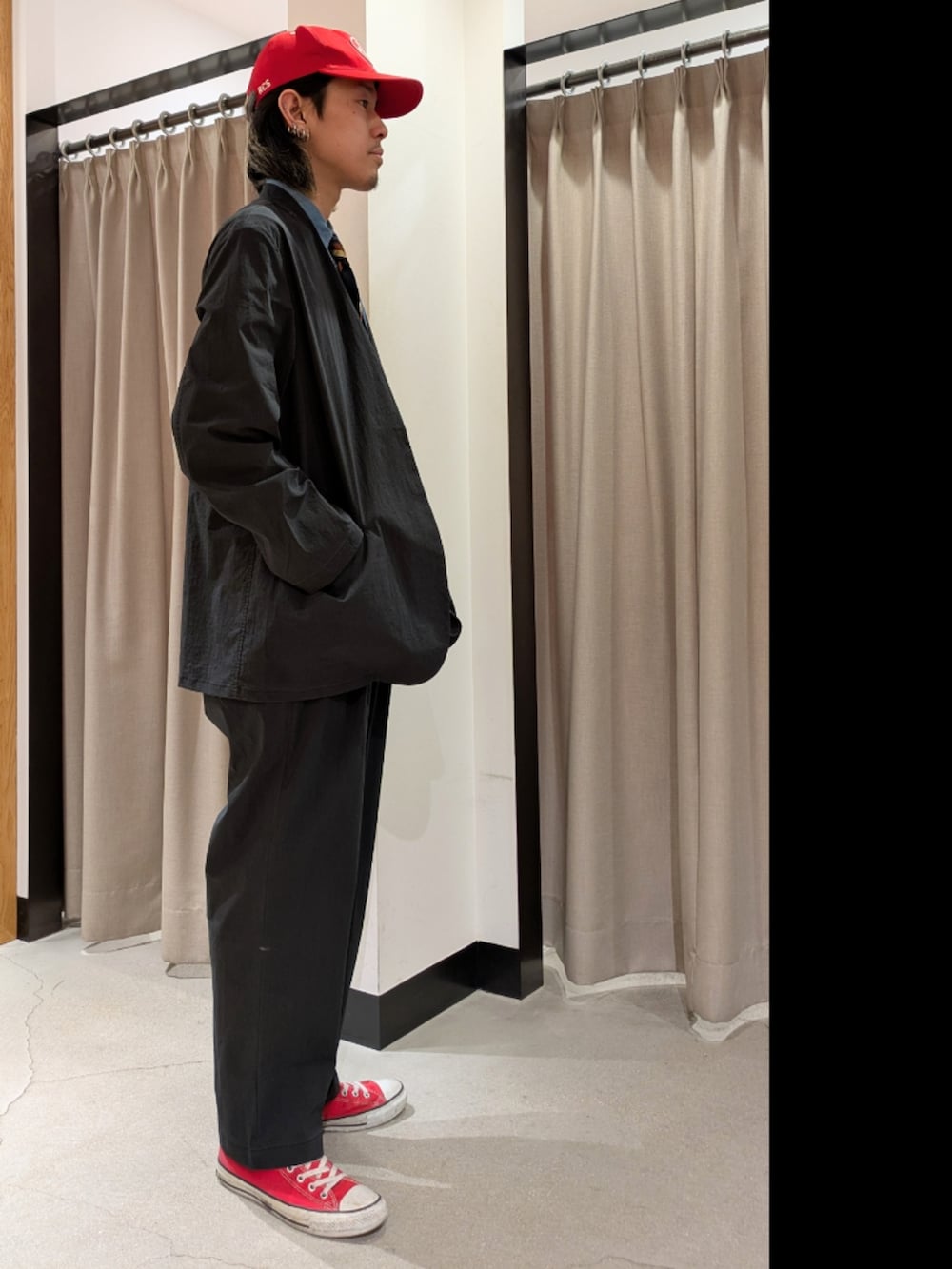 ノーカラージャケットのセットアップで、カジュアルなセットアップコーデを組んでみました!