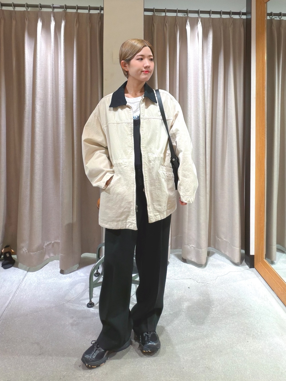 パンツは、スラックス、シューズはPARABOOTを着用し、キレイめな、大人っぽいコーデに仕上げました!