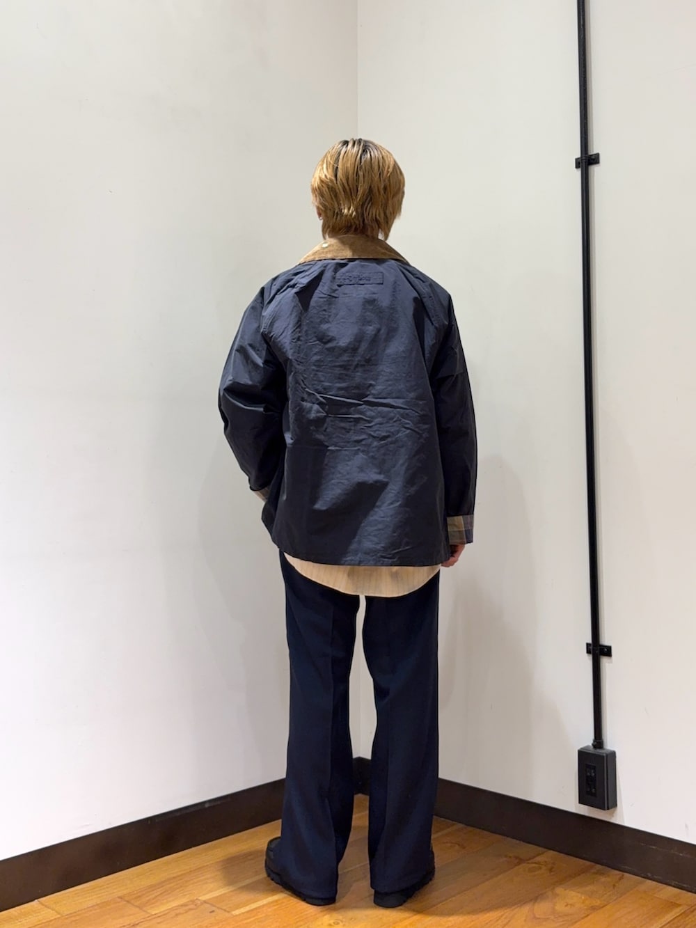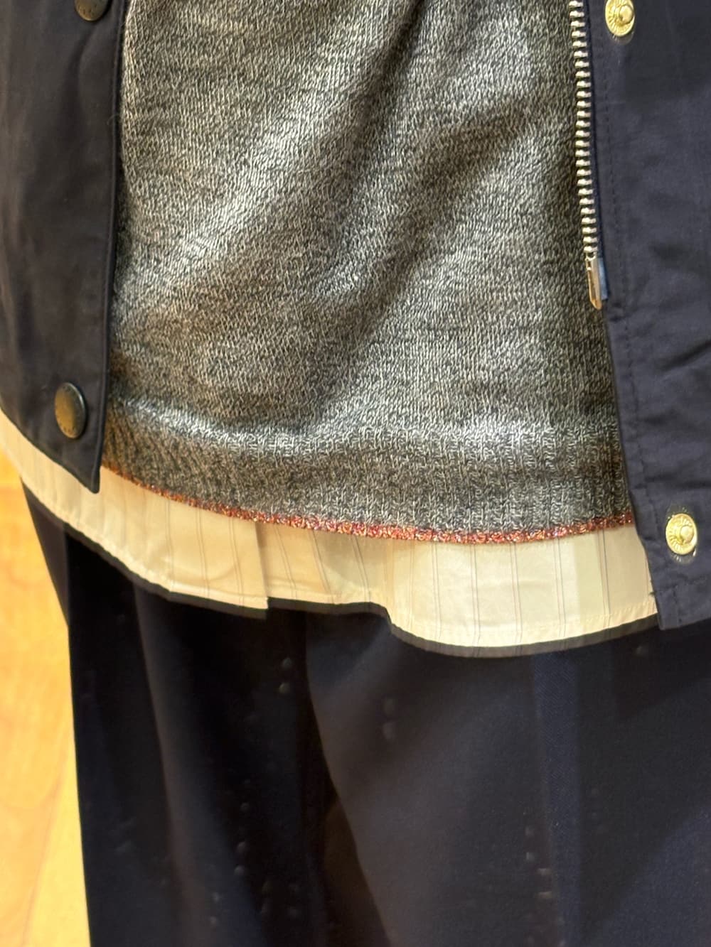 THOMAS MAISONのキレイめなシャツにcrepusculeの軽やかな上品ニット、barbourのトラディショナルなジャケットと、全体をスッキリ見せつつ締めてくれるwranglerのパンツとclarksのローファーです。それぞれのアイテムが他のアイテムを補完し合う最高の組み合わせです。