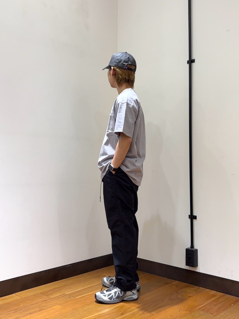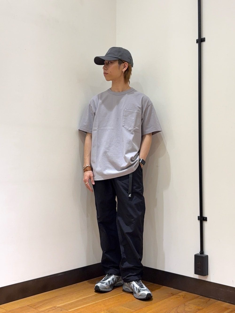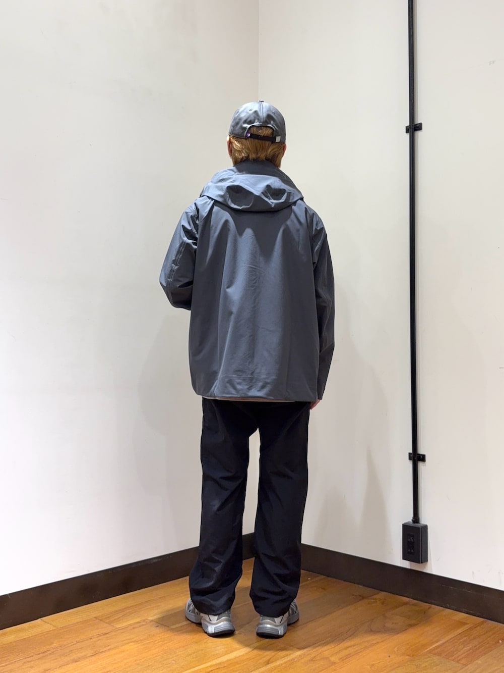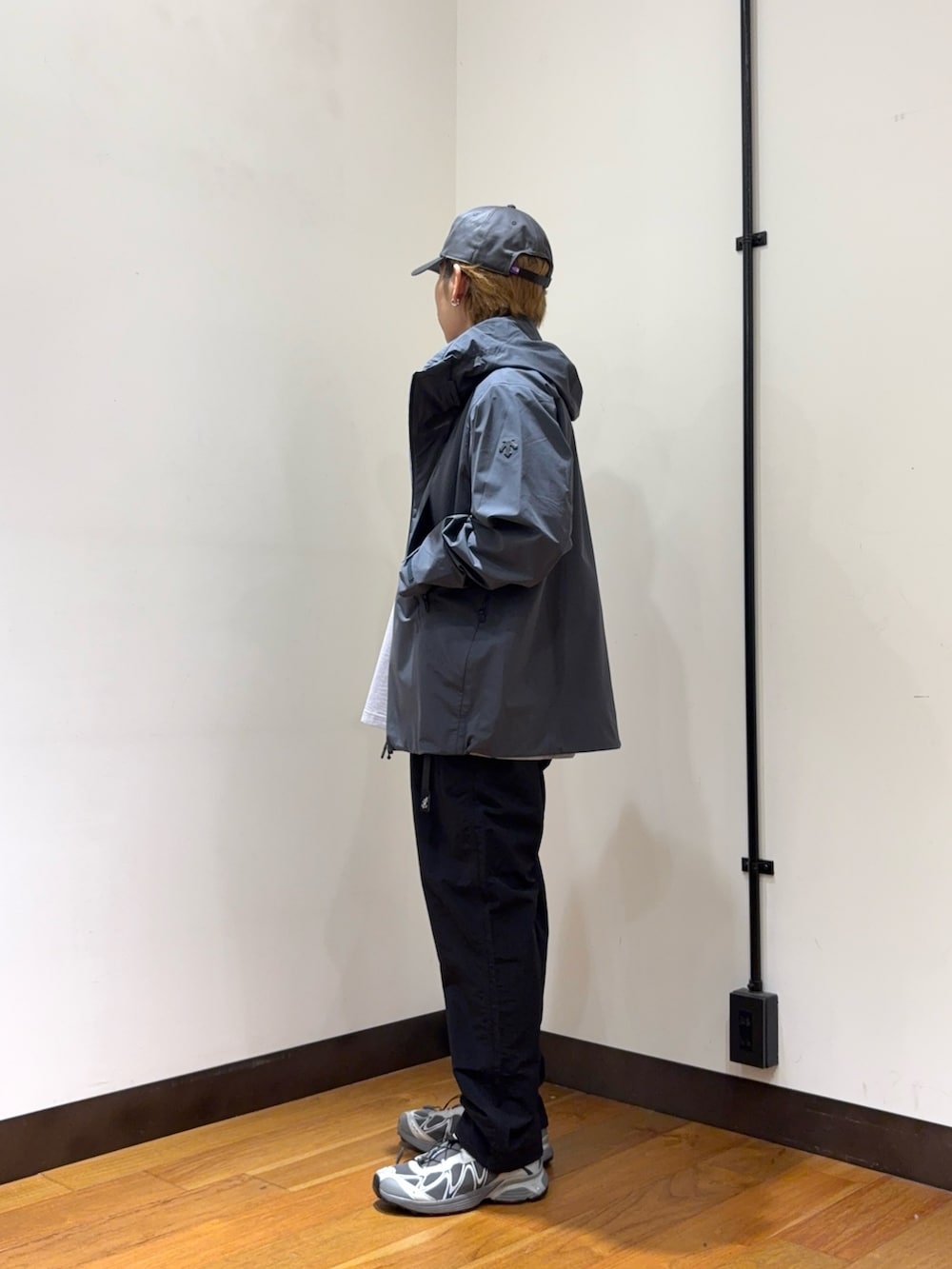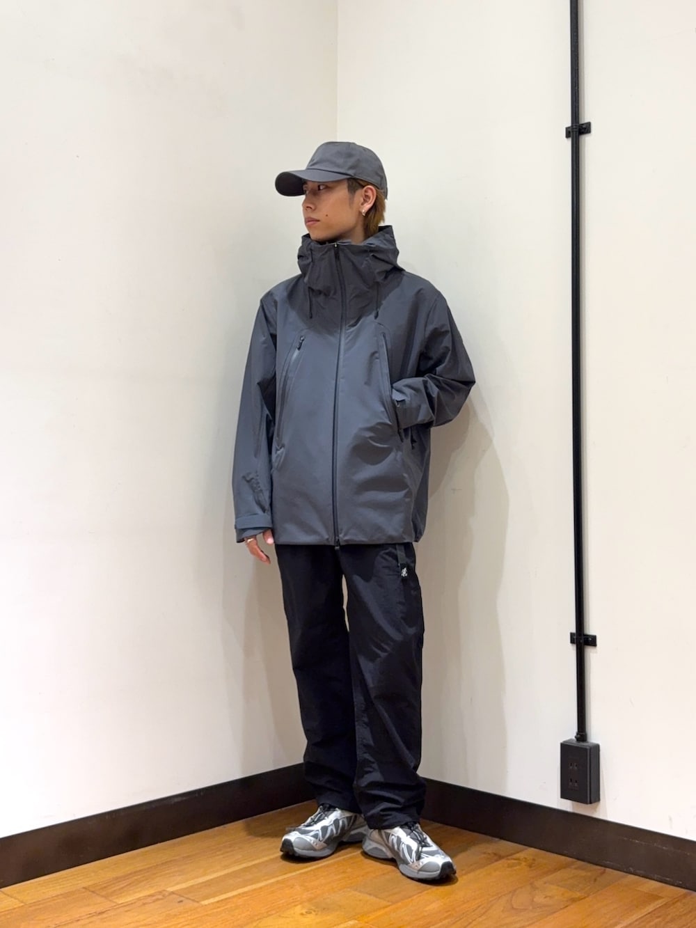 ジャケットやパンツでアウトドア感が出ていますが、スニーカーで少しテック感を出してコーデに鋭さを与えてくれるのもポイントです。
