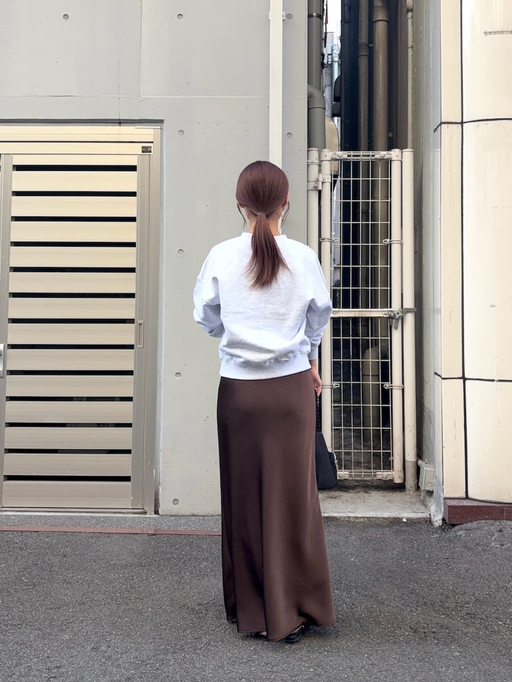 合わせたのは光沢感があり華やかに見せてくれるサテンスカート!