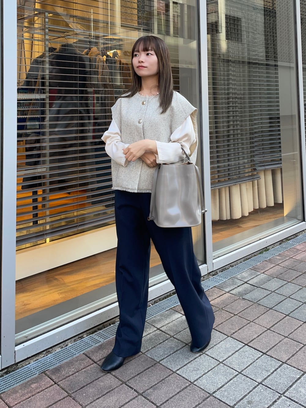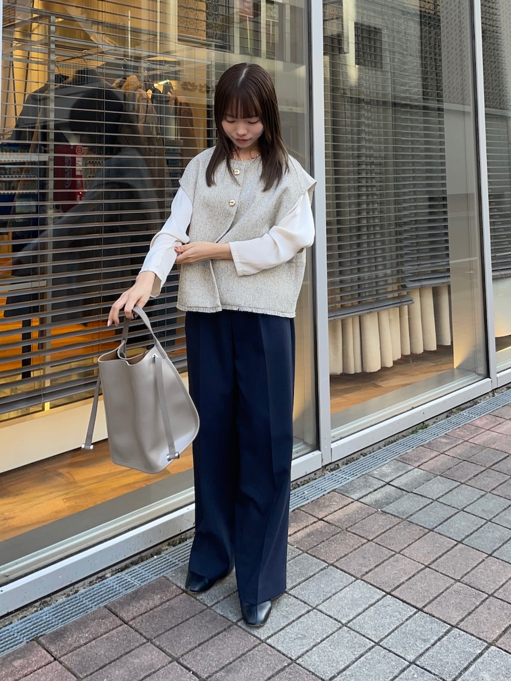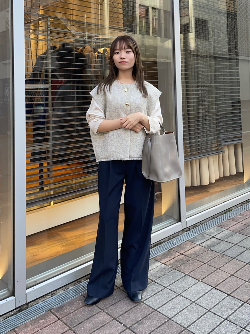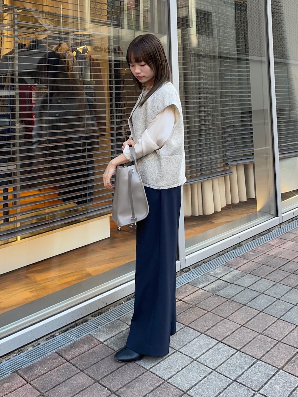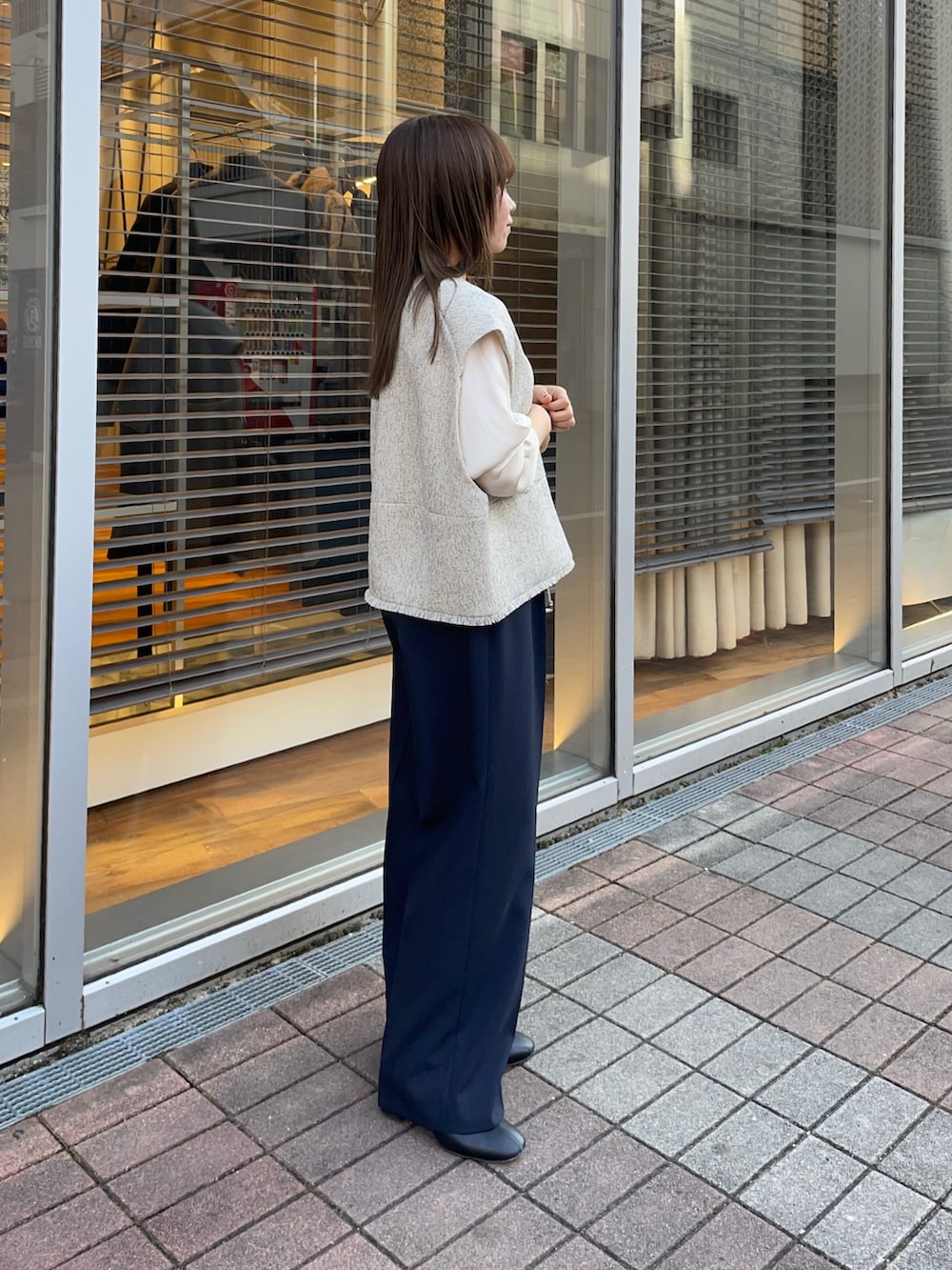トップスは別注のツイードショートベストをサテンのインナーと合わせてみました!CHIGNON/シニヨンというブランドに別注した特別なベストで、ジレと金色のボタンが高級感と華やかな印象を与えてくれます!着た感じはとっても軽く肩幅があえて長めに作られたデザインが肩幅華奢な人も合わせやすかったです✨