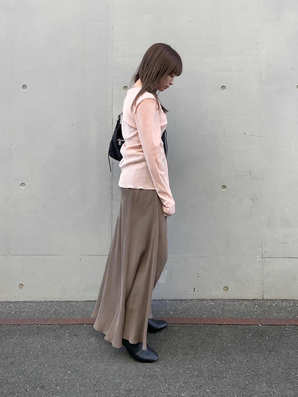 スカートはキュプラバイアスカートで、形がとってもキレイで広がりも上品で大人気のアイテムです!私の身長で若干ウエスト折って履いているので、お直しや厚底の靴などで低身長は調節されて下さい✨通年使える素材で、キレイめとしてもカジュアルにスニーカーにも合いますよ!