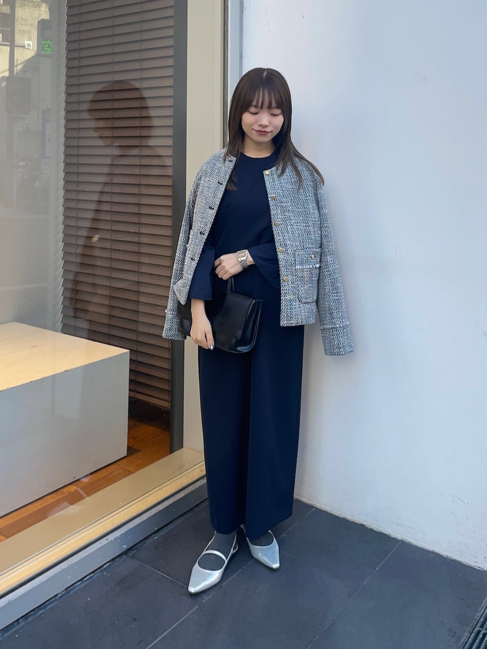 ジャケットは、ノーカラーツイードジャケットでFreeサイズですが、肩幅狭い私で着られてる感なく、合わせやすいアイテムでした✨高級感漂うツイード素材ですが、全く重さもなくさらっと着やすいですよ〜!