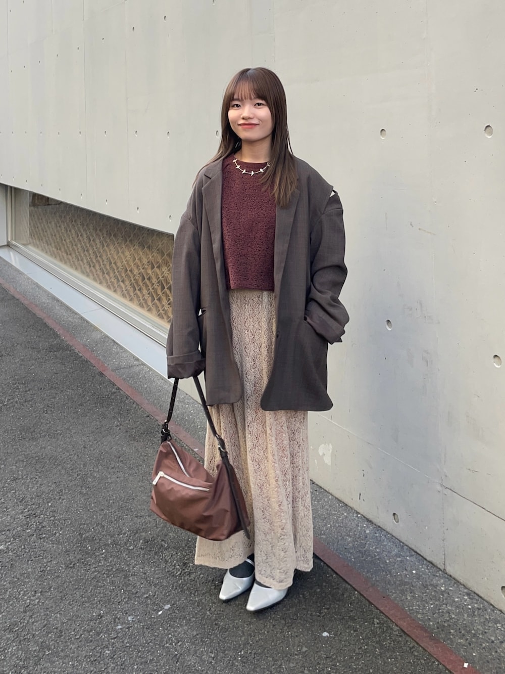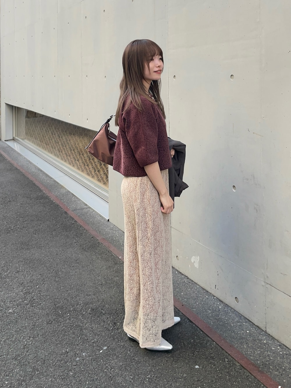 中のトップスも短丈のニットで、ジャガード素材が可愛く、深みのある赤が珍しいトップスです!もちもちした着心地と触り心地でストレスフリーで着ていただけます!