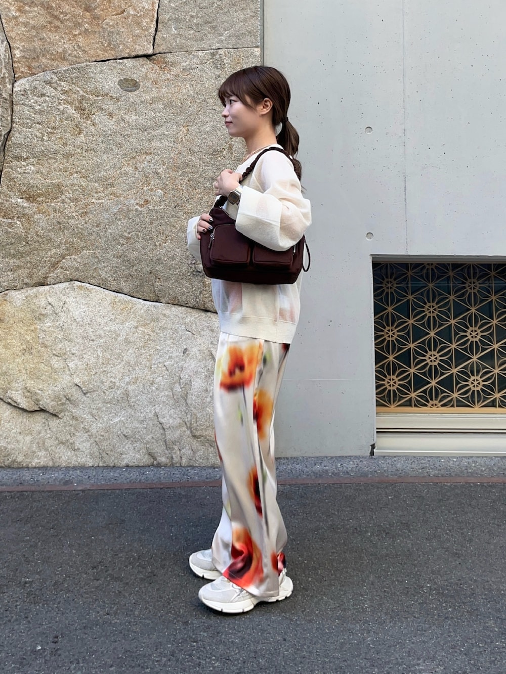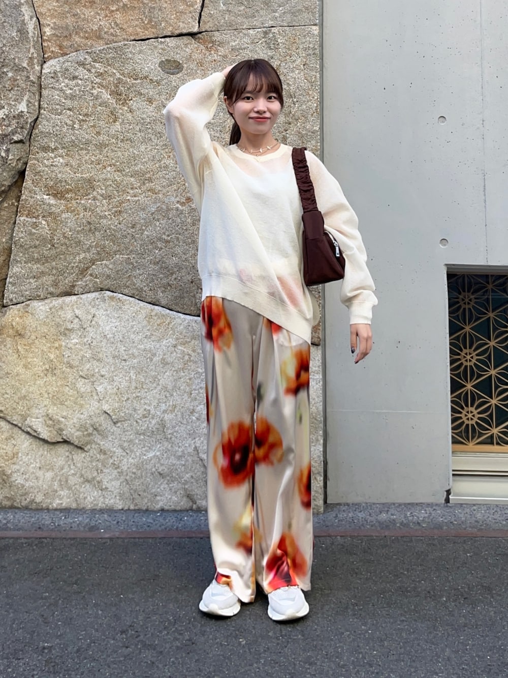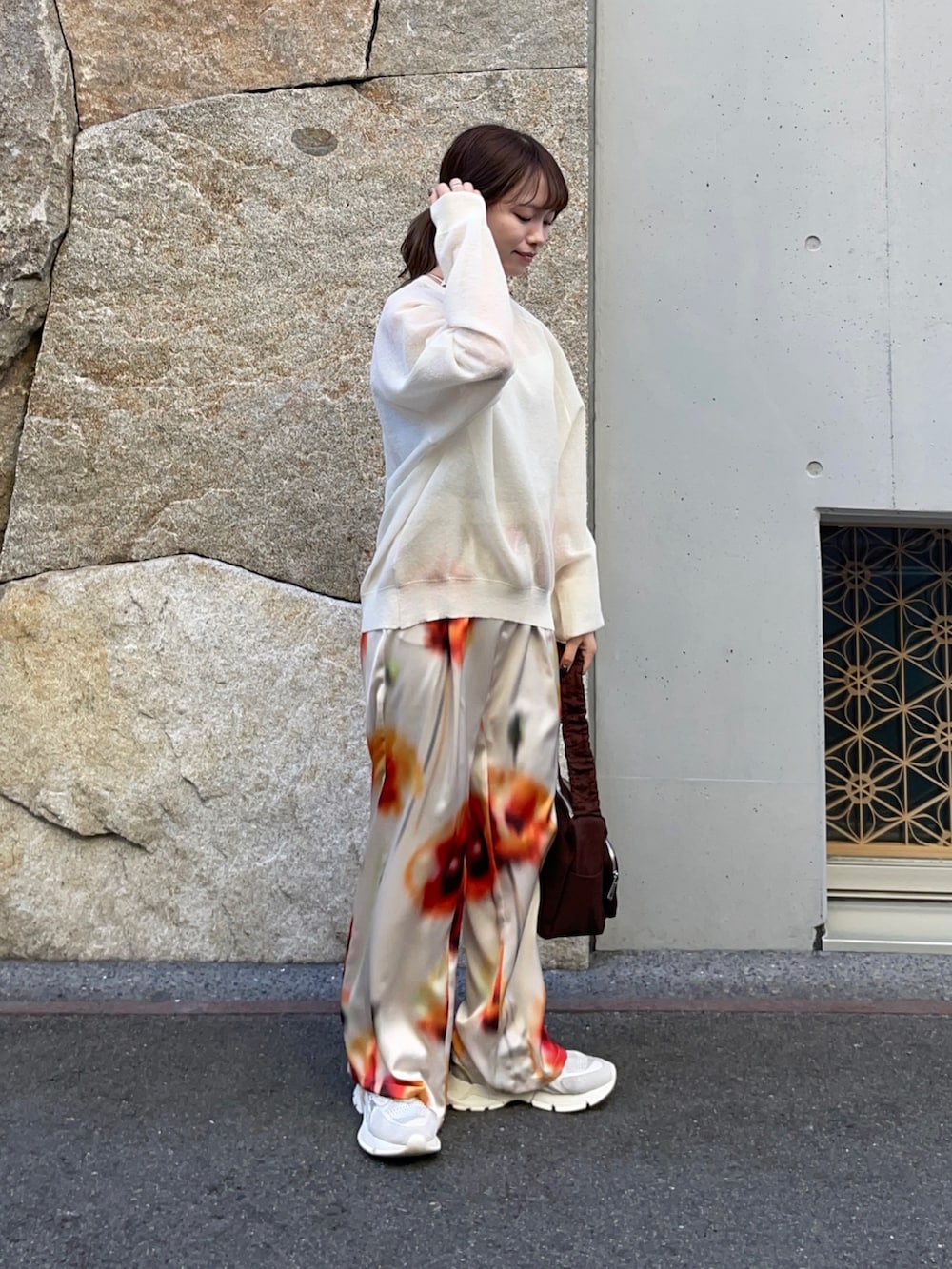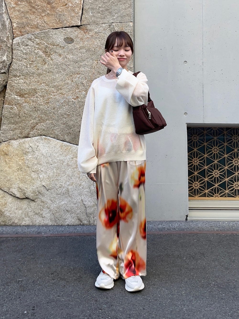 ボトムスはポピーフラワーギャザーパンツで、花の模様が可愛く、目を引くアイテムです✨サテンの生地で着心地最高です!シワもつきにくく、春から夏も大活躍間違いなしです!