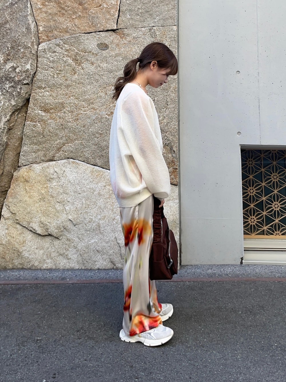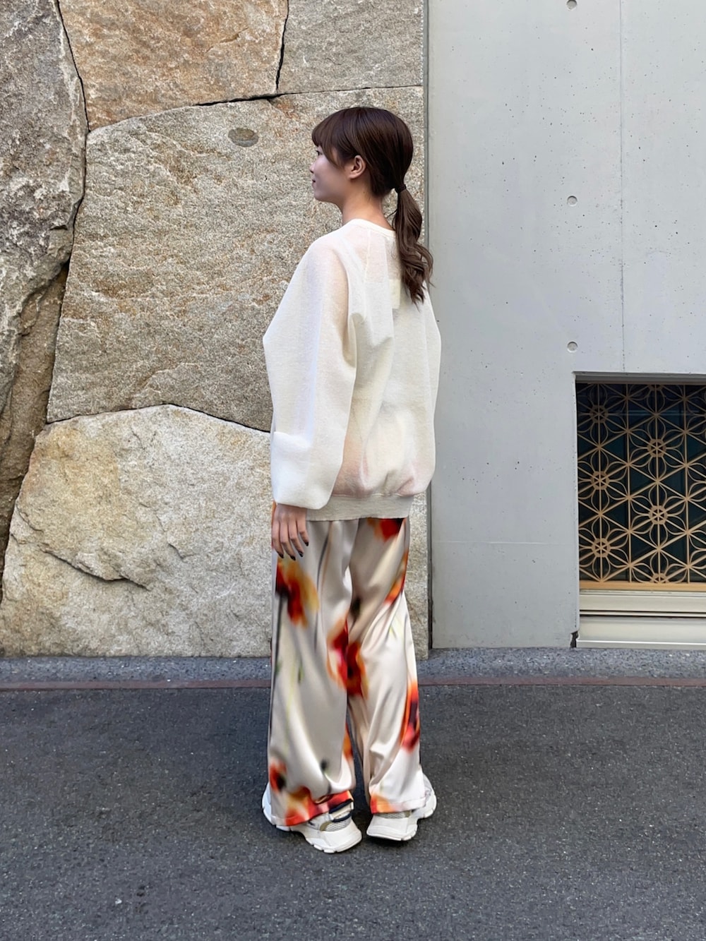 トップスはリネン混スポンディッシュニットで、シアー素材と気持ちの良い触り心地で、軽やかな着心地でした!ゆったりとした身幅なので、今の時期はロゴ長袖Tシャツをインナーに入れて使ったり、夏はキャミでも可愛いと思います!これからの時期にぴったりです!
