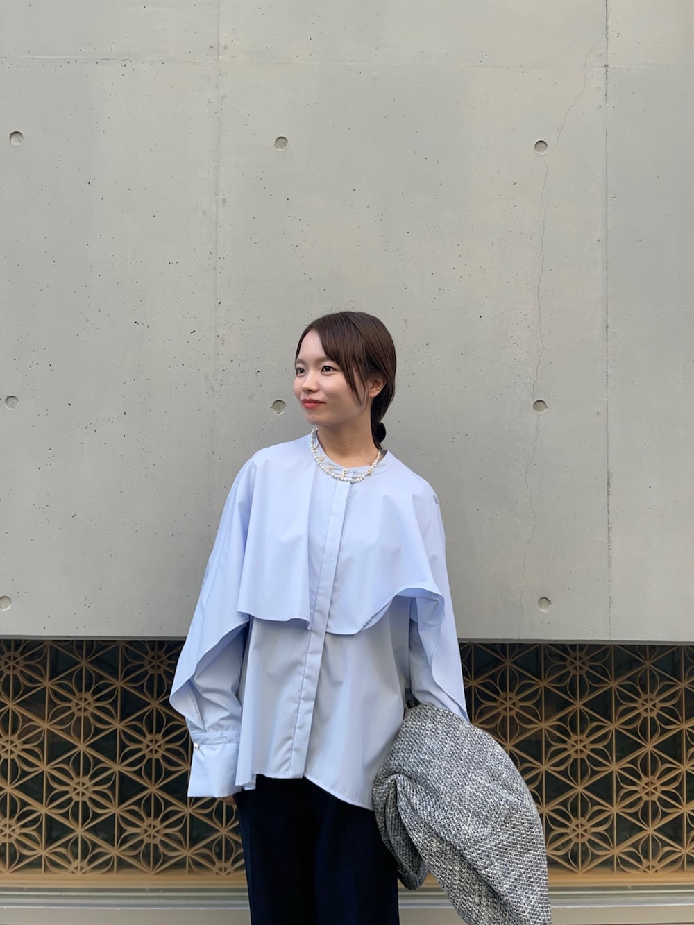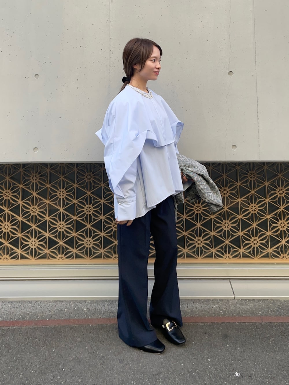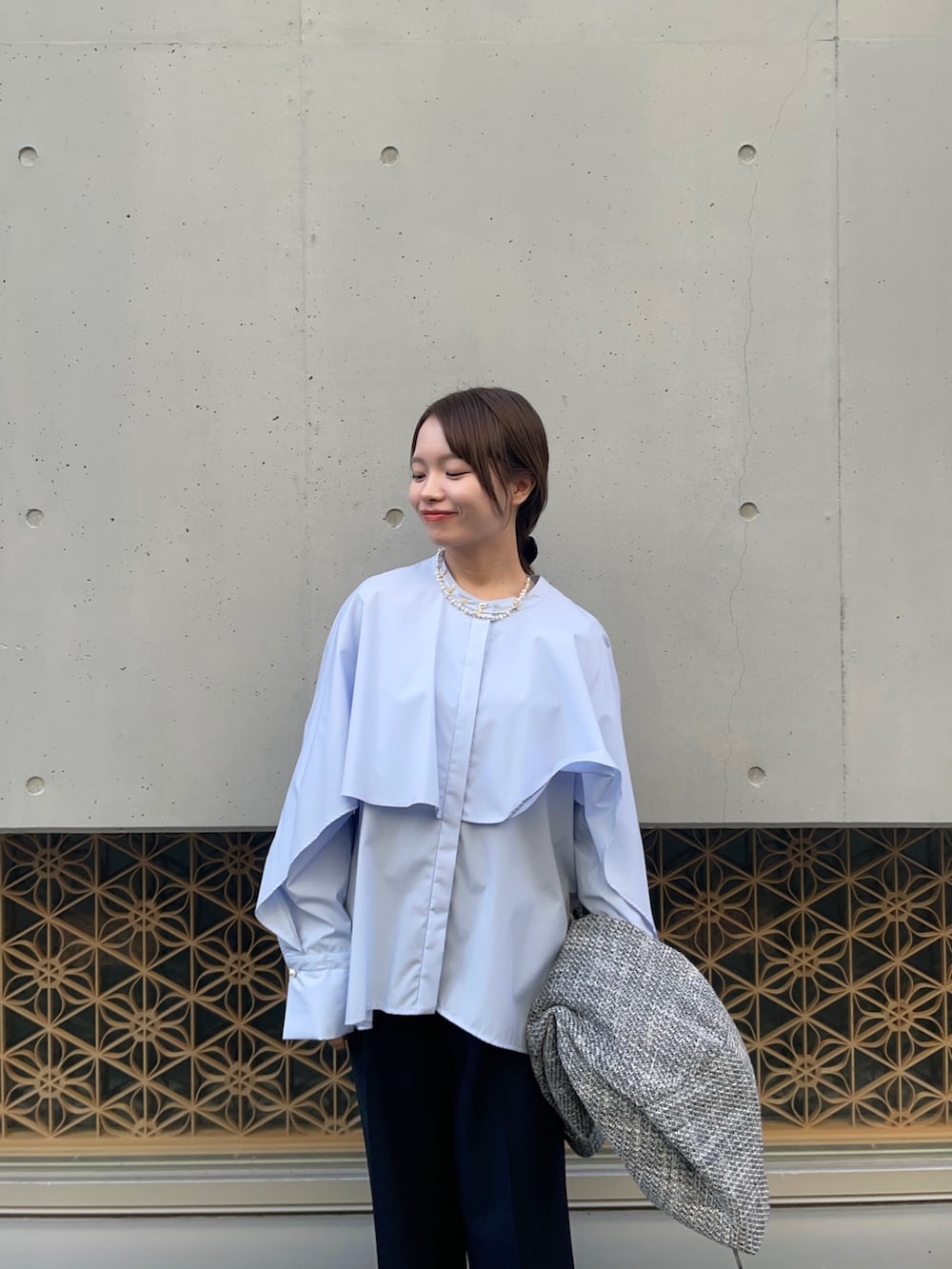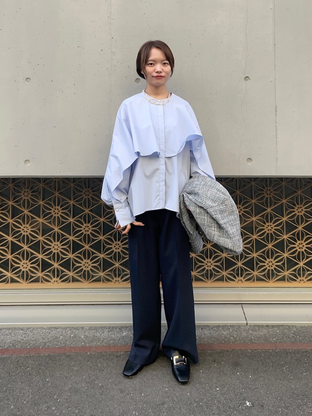 中のシャツは別注ラッフルシャツブラウスです!CHIGNON/シニヨンにアーバンリサーチが別注した立体的で存在感のあるアイテムです⭐︎ジャケットを上から羽織っても良いですし、シャツ1枚でも様になりますよ✨