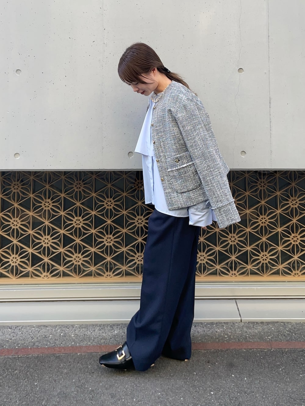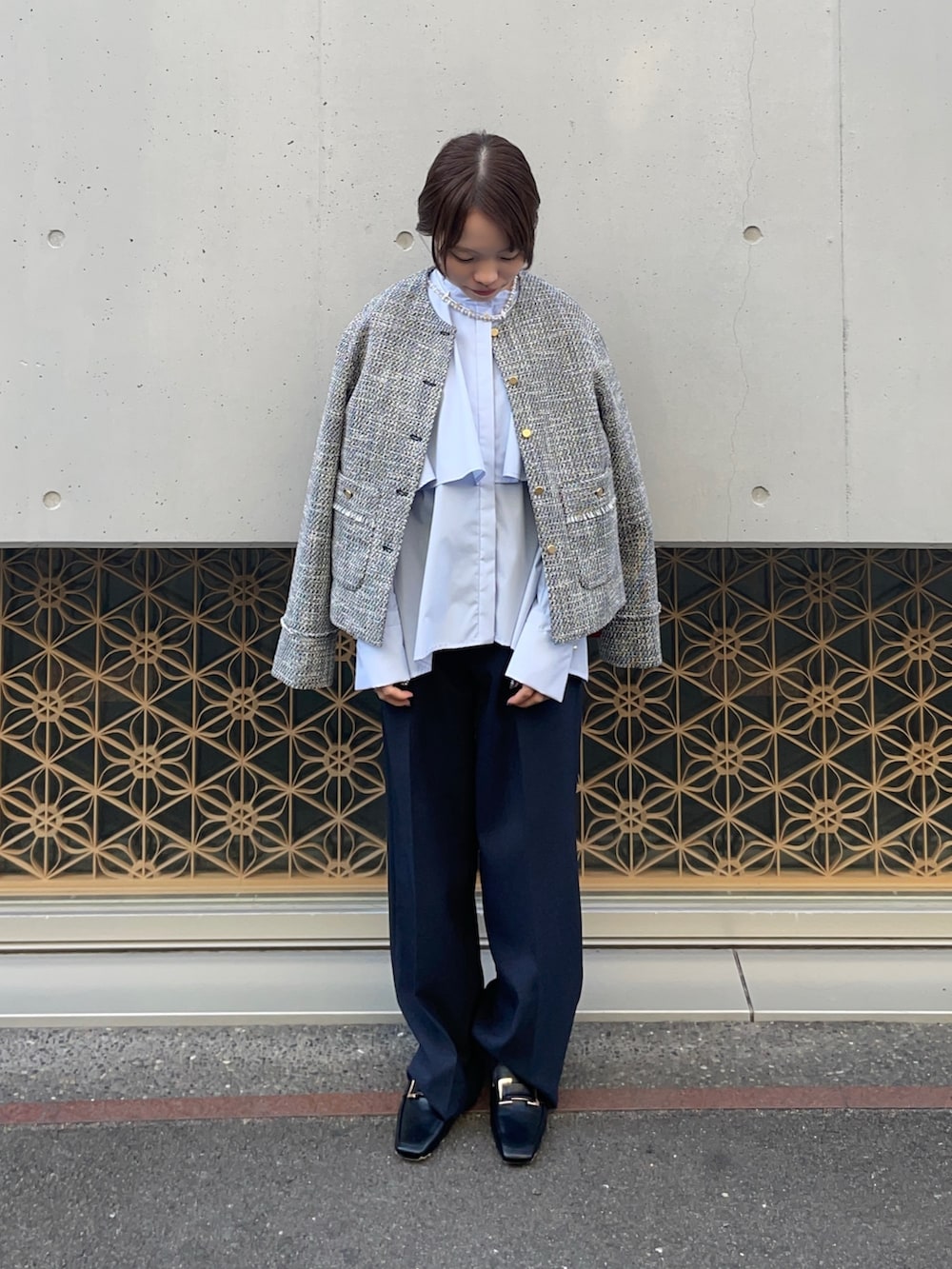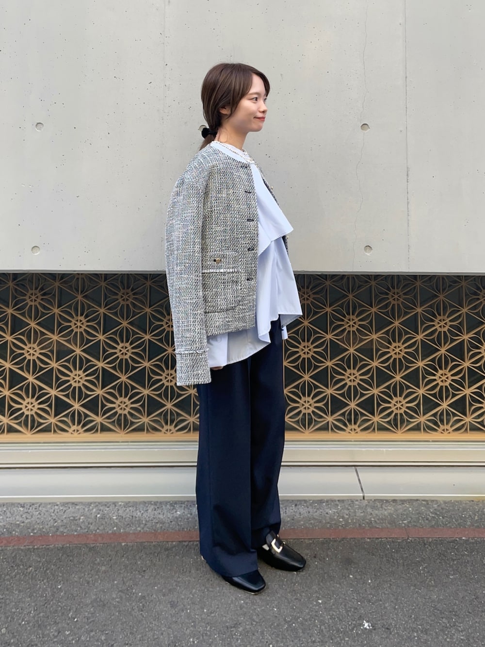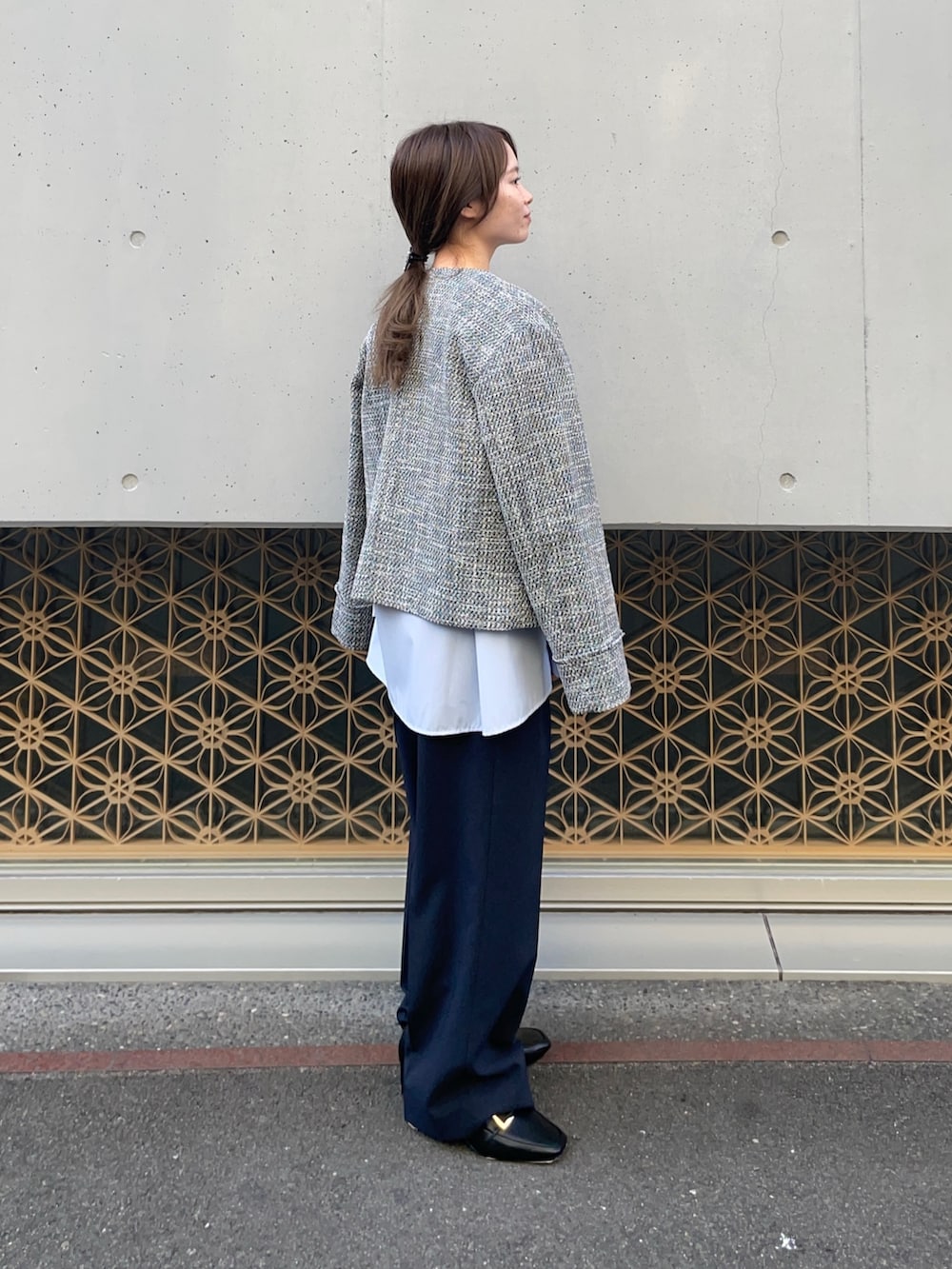 ジャケットは店頭でも大人気のノーカラーツイードジャケットです!サイズはフリーですが、肩幅狭い私にもちょうど良いサイズ感でした◎全く重さも感じないので着ててストレスフリーです!さらっと羽織れて持ち運びもしやすいですよ♪