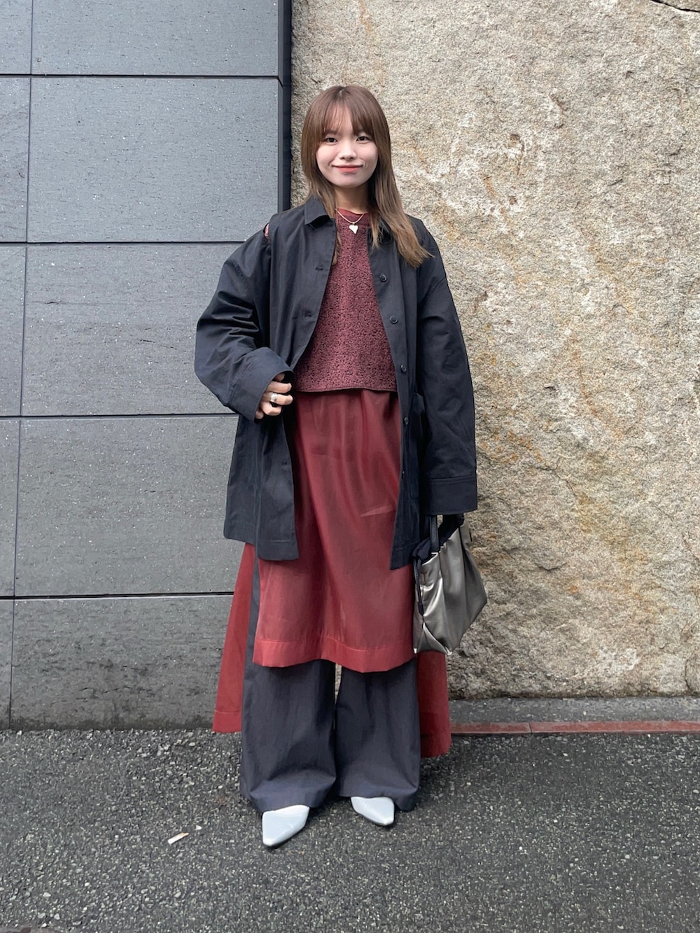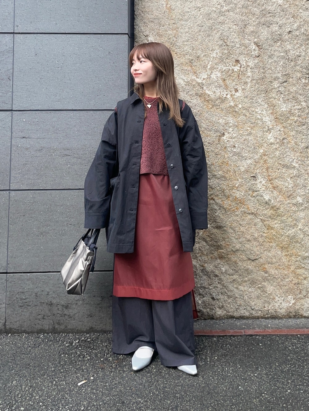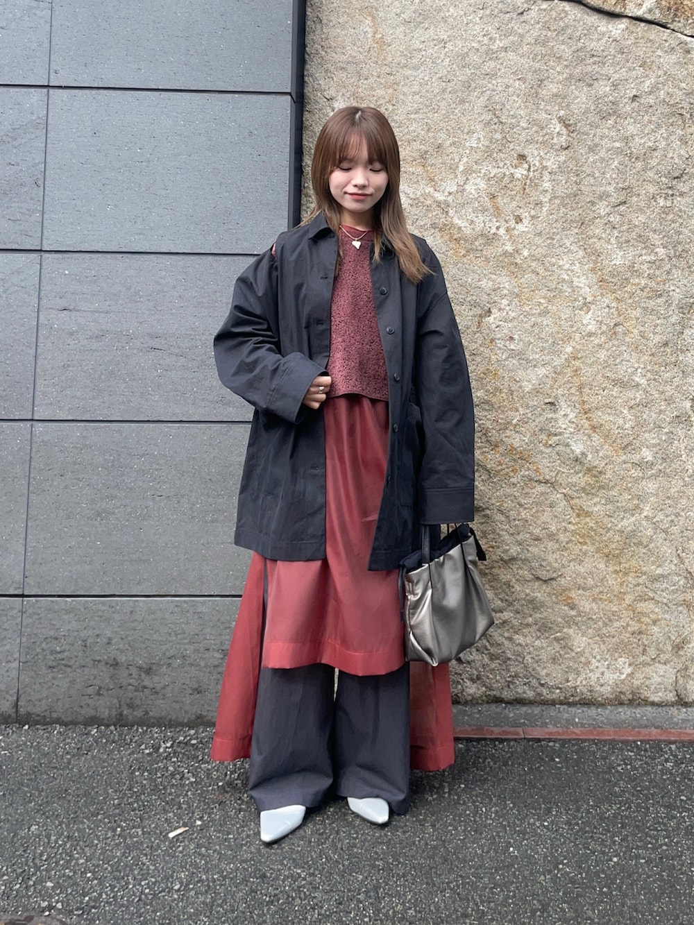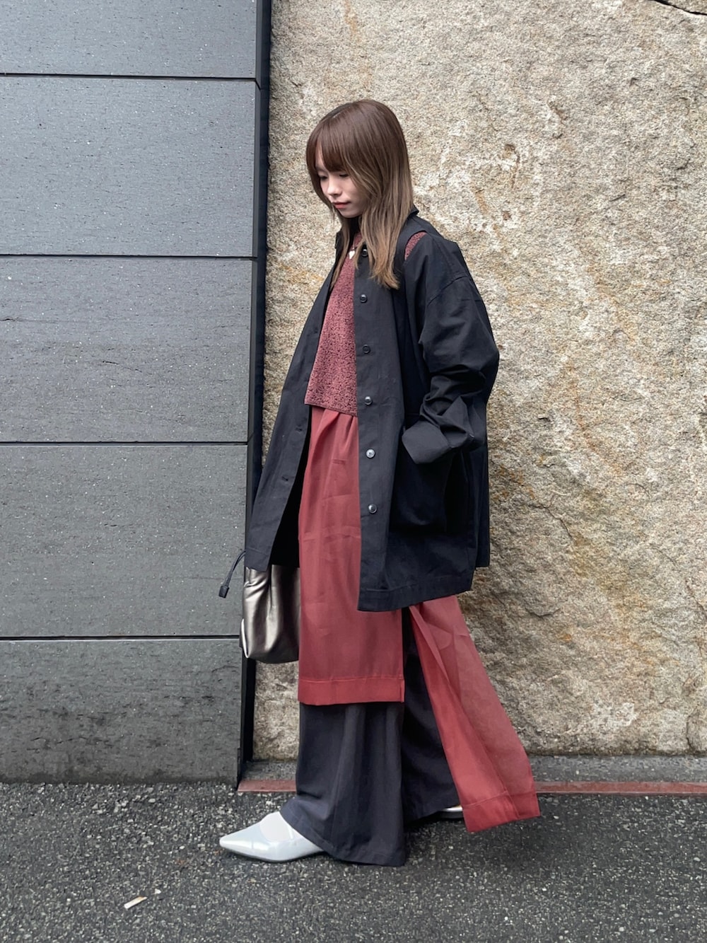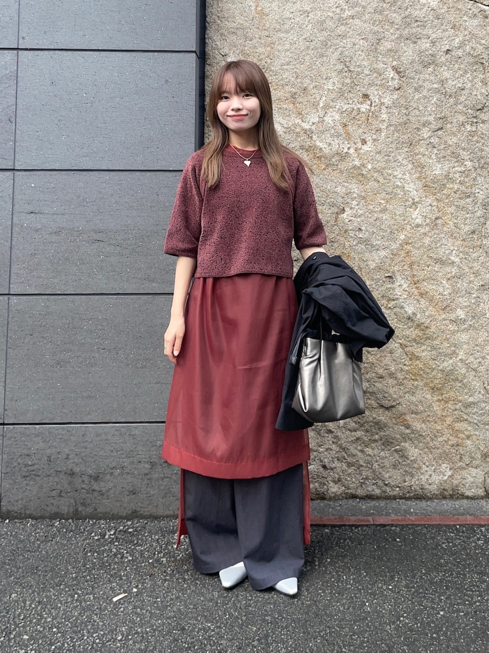 中は半袖のトップスにシアーのワンピースを下に重ね着してみました!ジャガードデザインのもちもちとした素材が着やすいトップスです!短丈が低身長には嬉しい♪シアーアイテムもパンツと重ね着してもスリットがサイドにあるため、インナーも見せて遊んでいただけます!