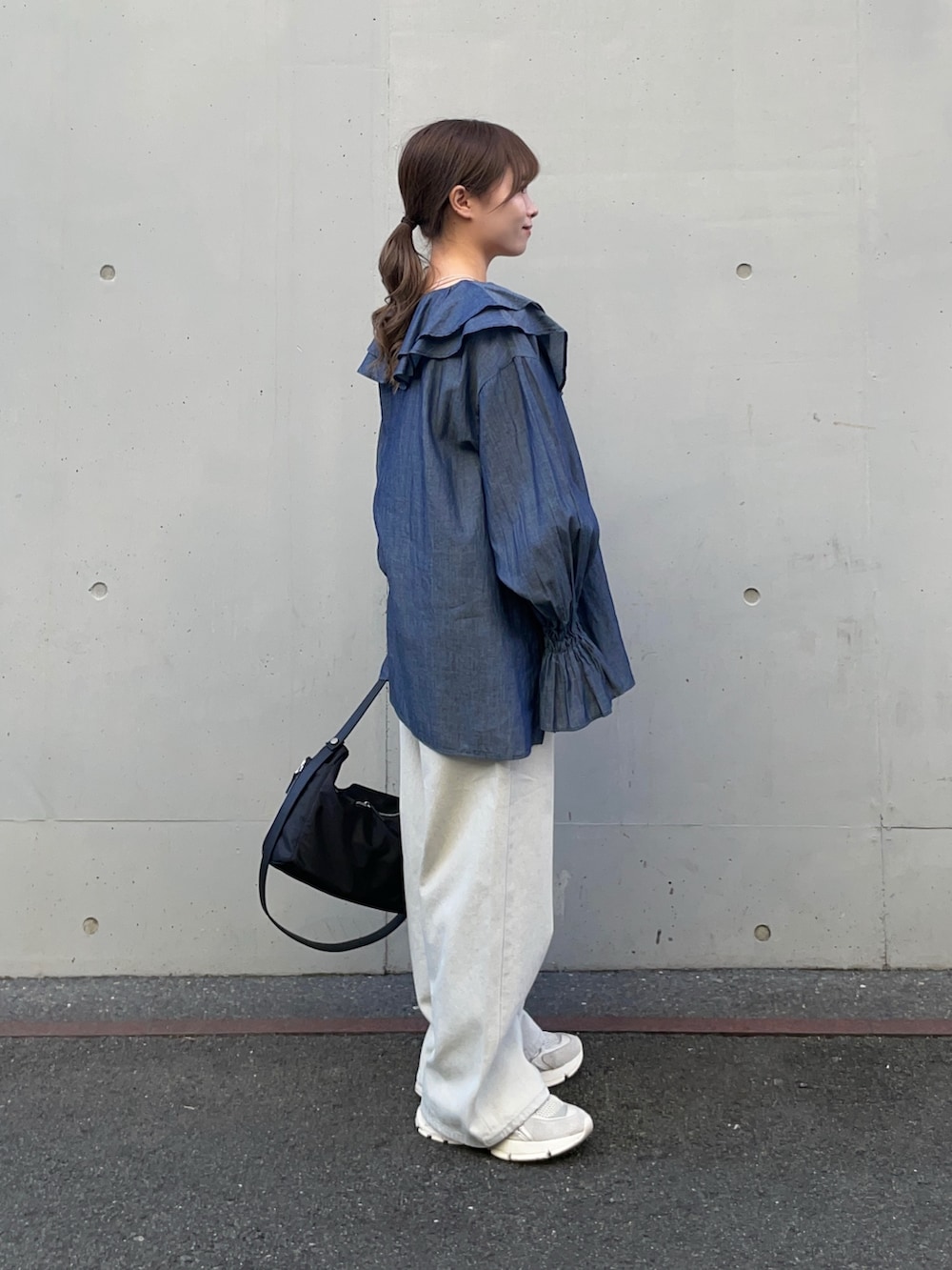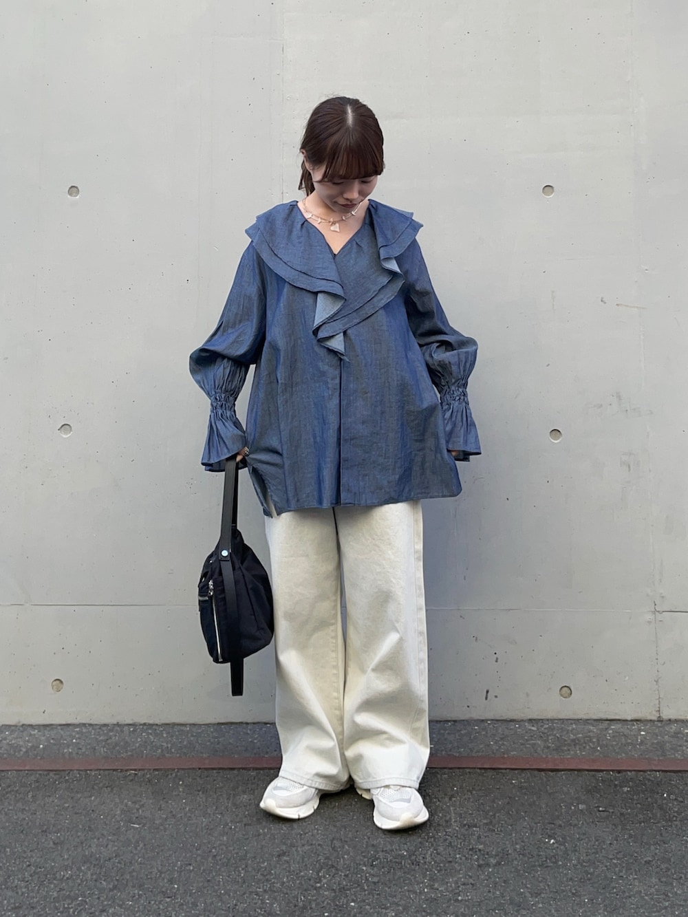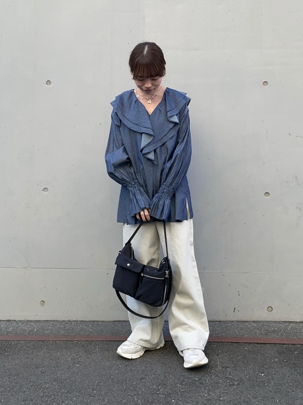 トップスはVネックラッフルシアーデニムブラウスです!首元スッキリのVネックが鎖骨をキレイに見せてくれます✨シアーデニム素材で薄すぎづ、分厚すぎない生地でさらっと着ていただけます!