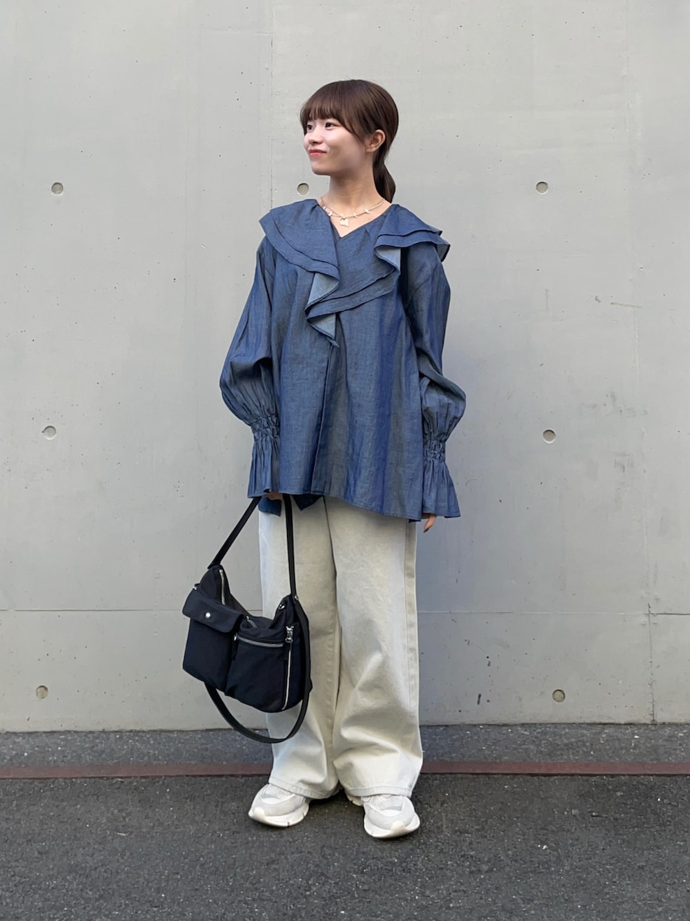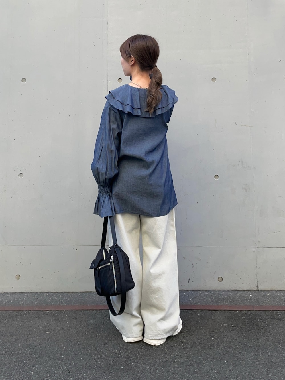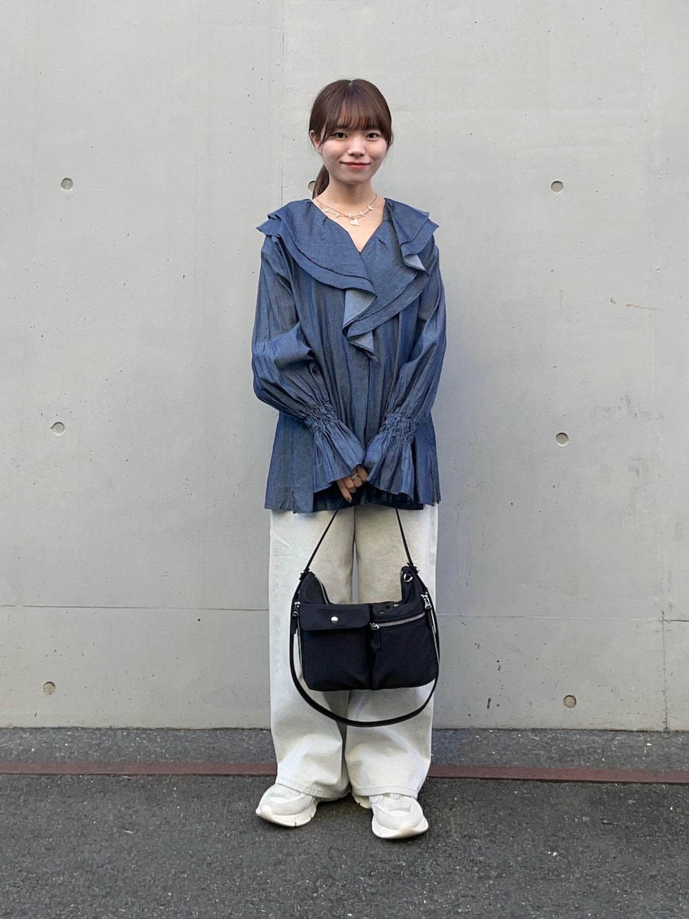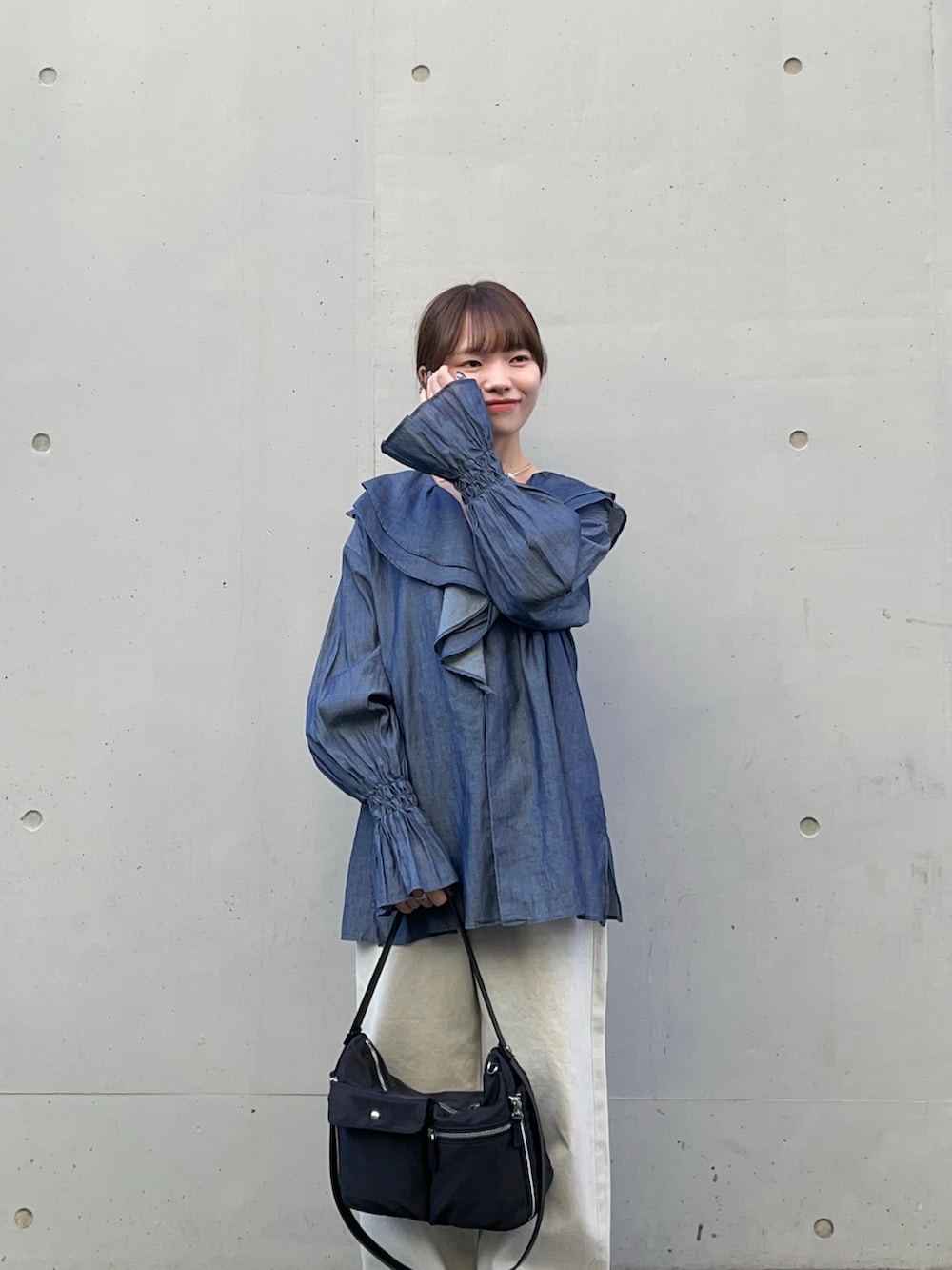 トップスはVネックラッフルシアーデニムブラウスです!首元スッキリのVネックが鎖骨をキレイに見せてくれます✨シアーデニム素材で薄すぎづ、分厚すぎない生地でさらっと着ていただけます!