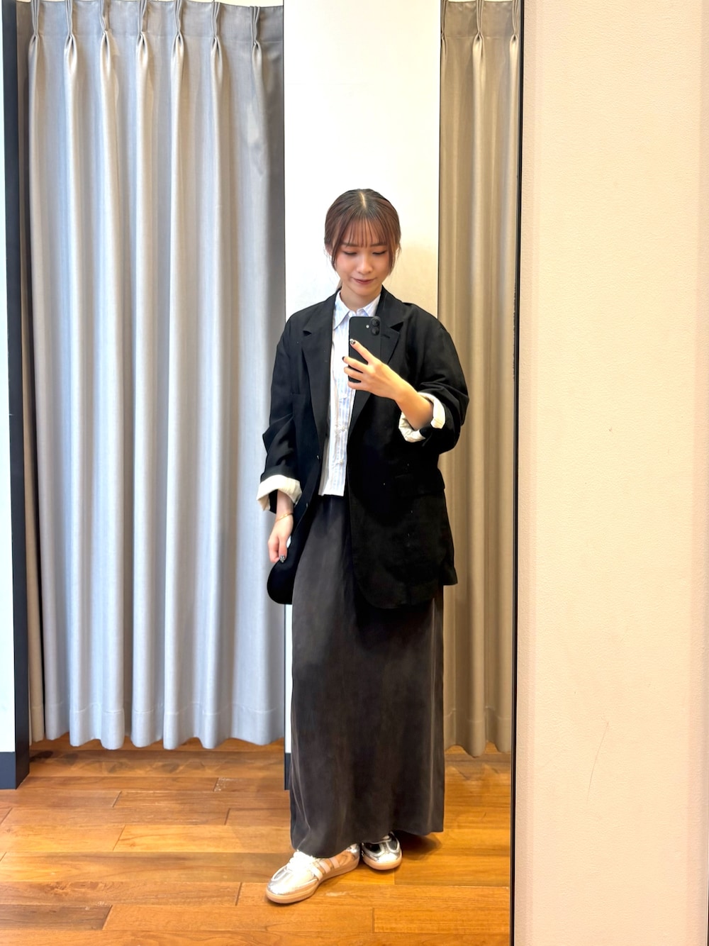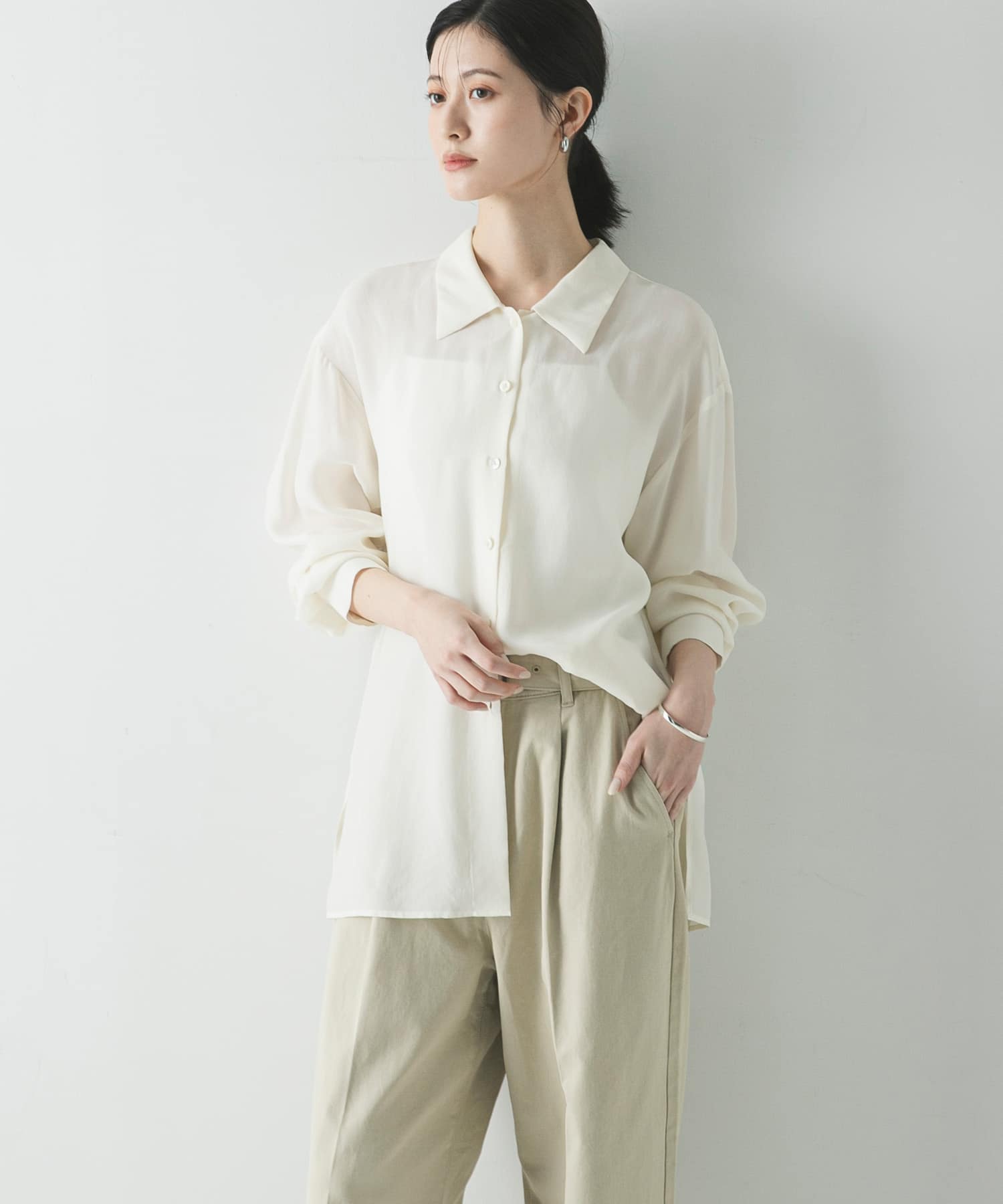 下のレースシアースカートは、もともとレイヤード用でも使えるので、低身長でも着れる着丈でした!裾のさりげないレースがチャレンジしやすいアイテムです!