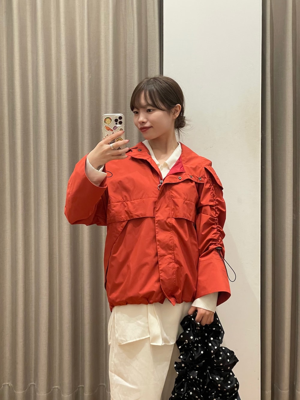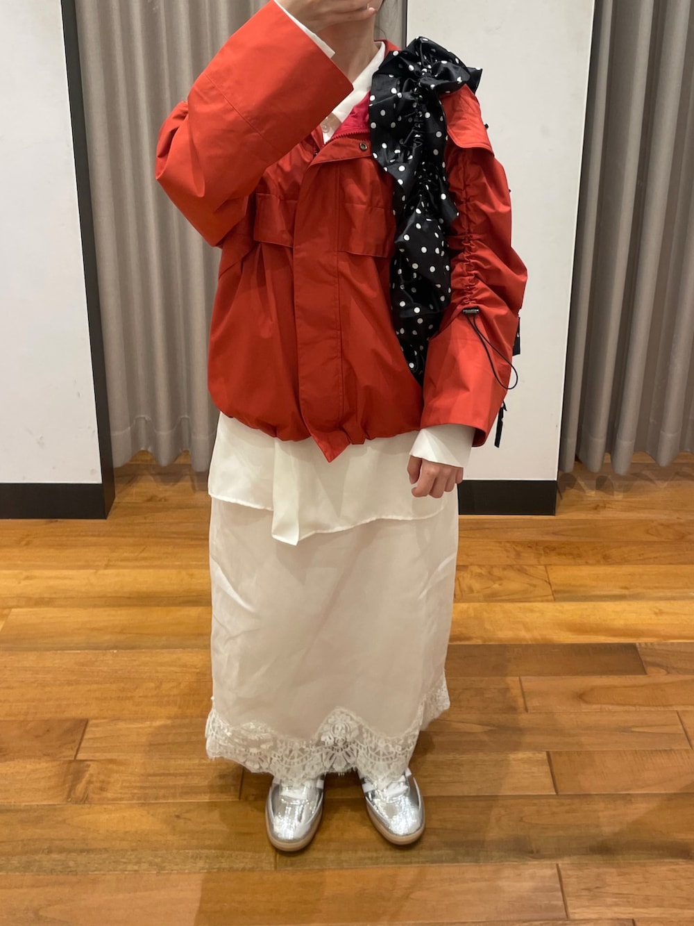 ジャケットはCAPE HORN/ケープホーンのアイテムで、袖のドロストデザインがおしゃれで、オレンジ味が強い赤のマウンテンパーカーです!デニム合わせでも、今私が着ている少し甘めのレーススカートの合わせもバランスが取れて、オススメですよ✨