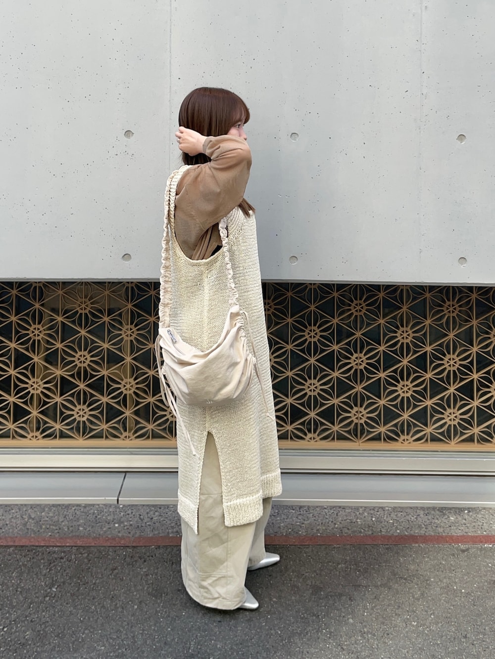 パンツはKBFのワイドコクーンパンツを履いてみました!こちらは3センチほど裾上げしており、リアルバイアイテムです!ゆるくカーブしてるデザインが一枚でも、シンプルなトップスにワンポイントで着こなせます♪