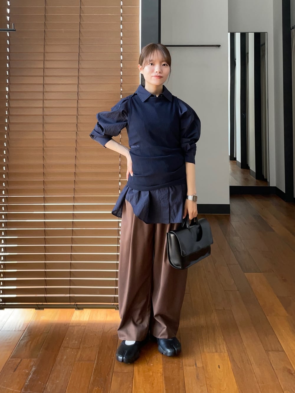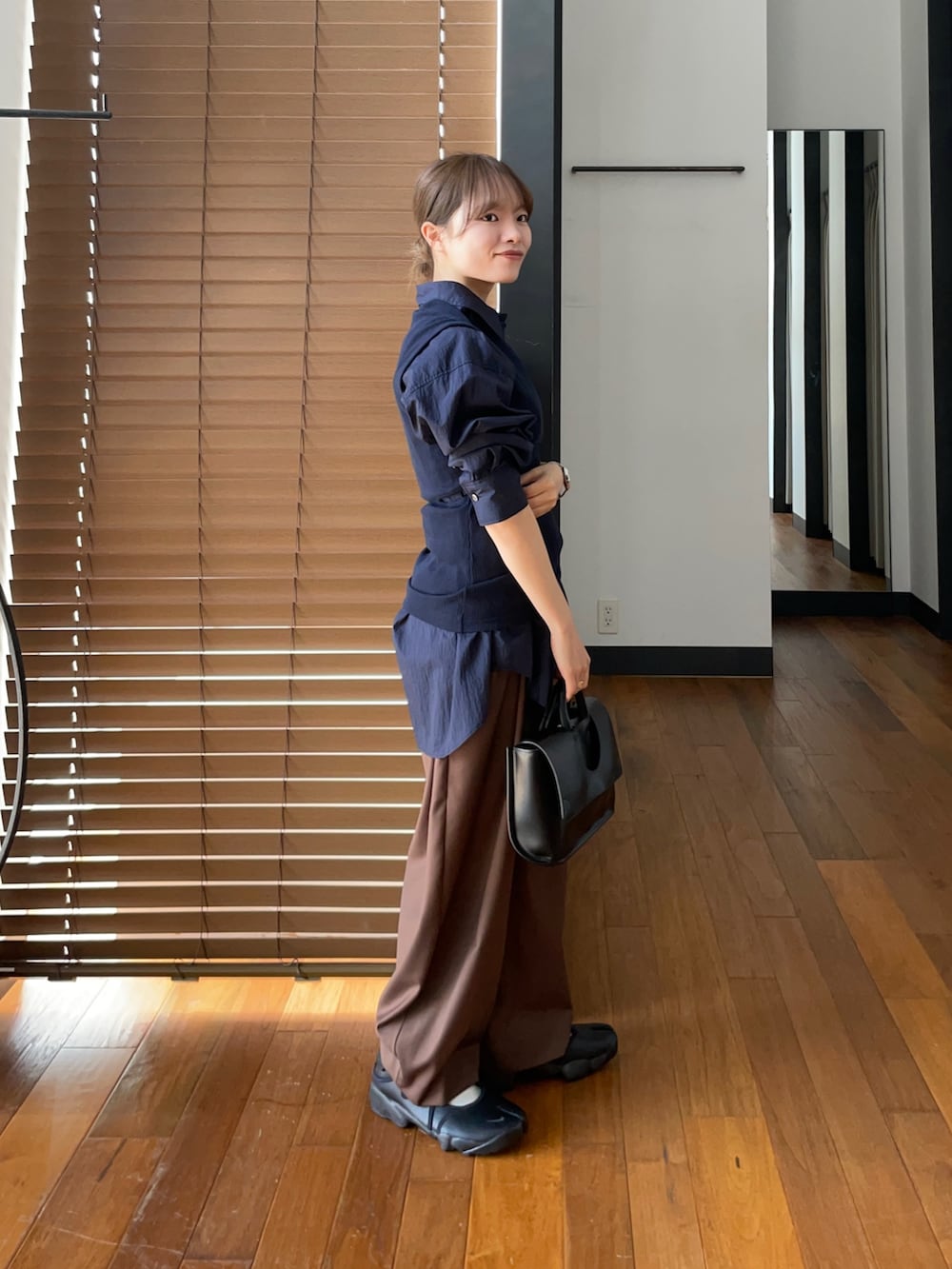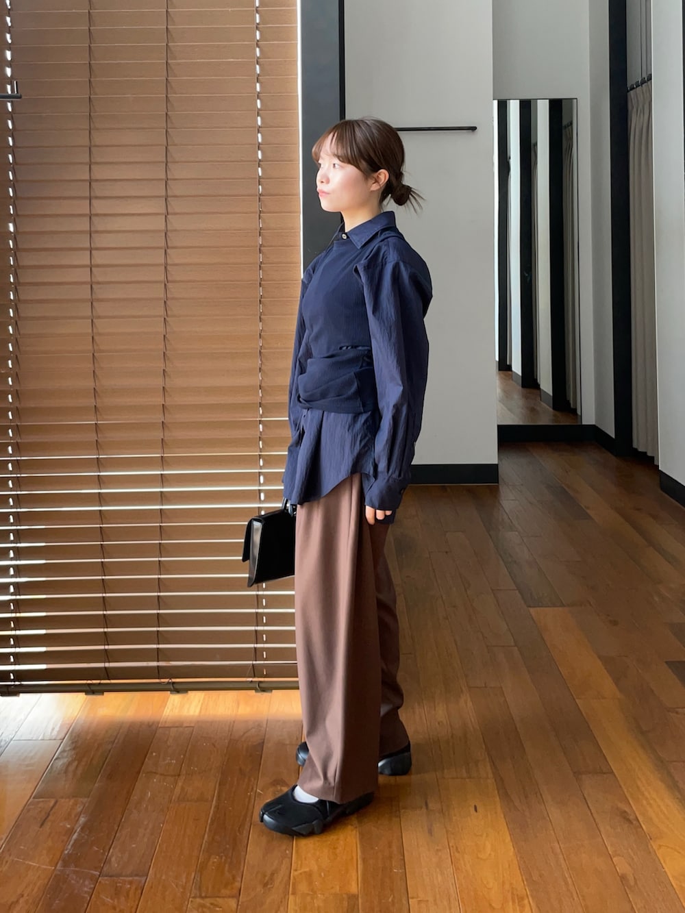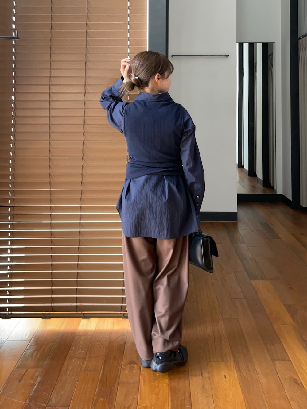 パンツはタックカーブスラックスで、私の身長で36のサイズを履いてます!タックが入っているため気になる太ももあたりはゆったりと、下にかけてカーブするデザインですっきりと見えるシエルエットになります!