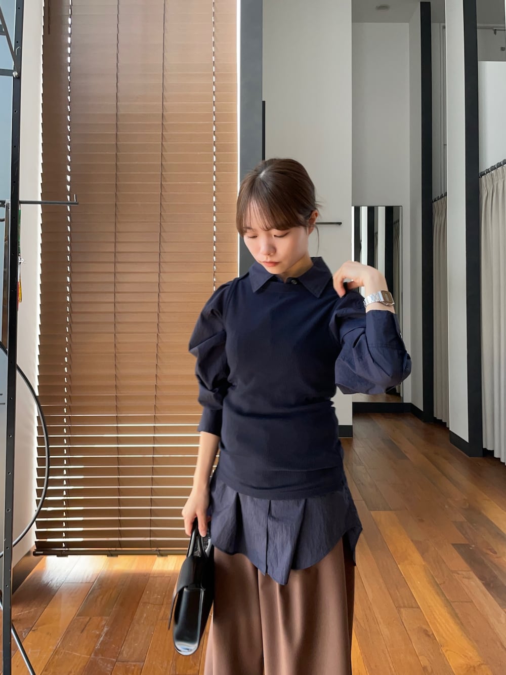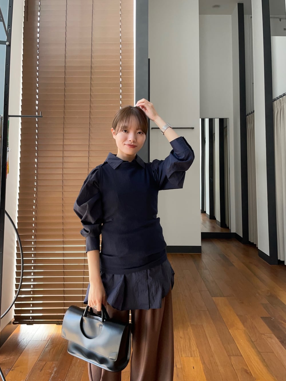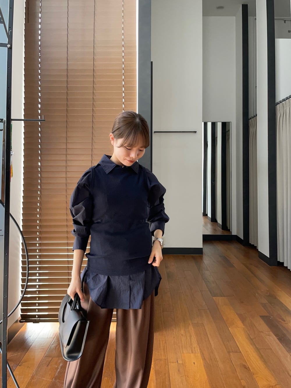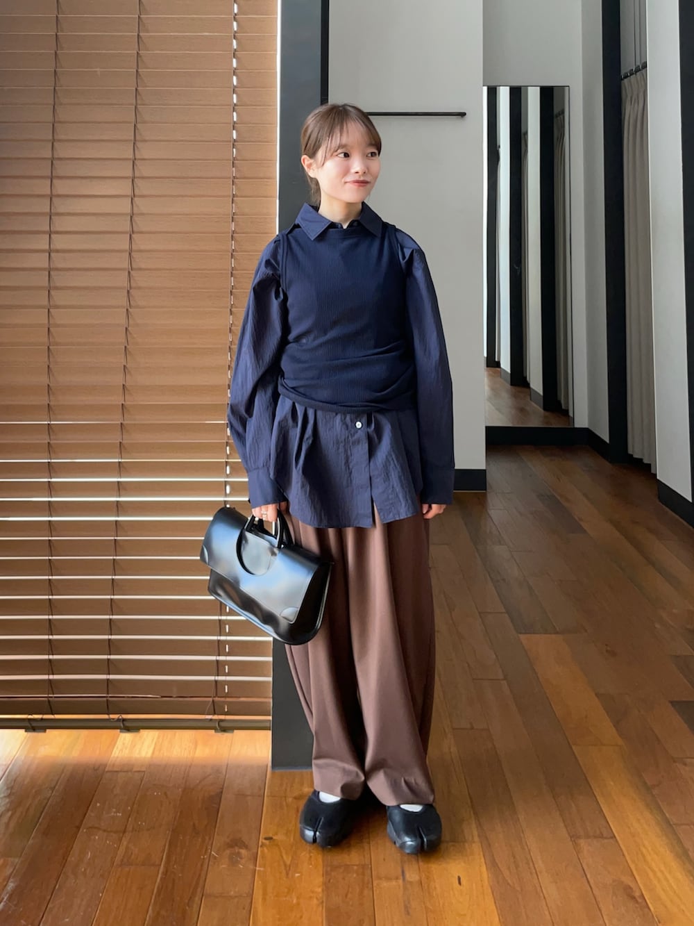 パンツはタックカーブスラックスで、私の身長で36のサイズを履いてます!タックが入っているため気になる太ももあたりはゆったりと、下にかけてカーブするデザインですっきりと見えるシエルエットになります!