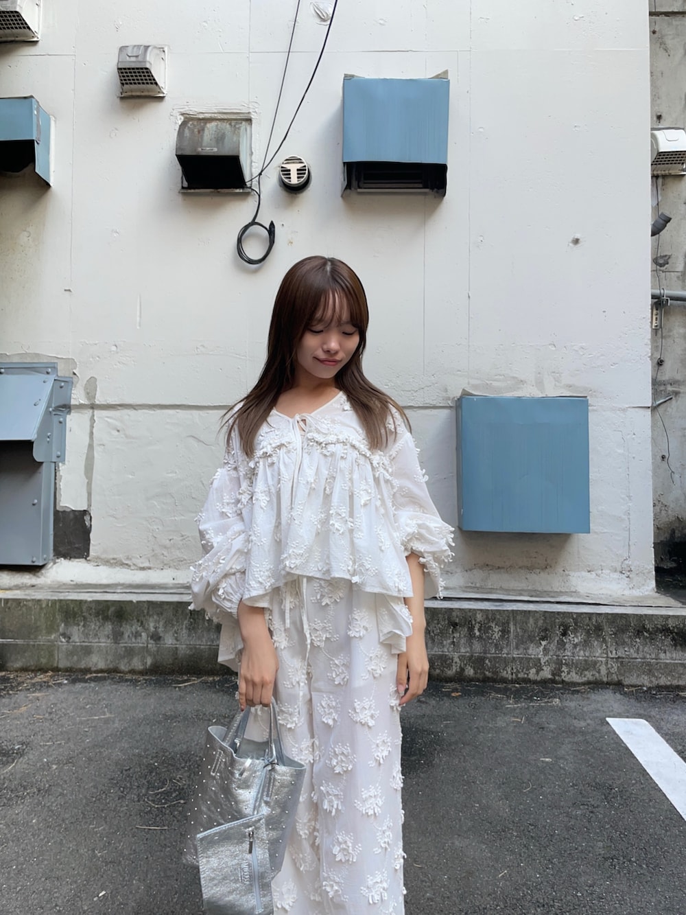 トップスのボレロは華やかなフラワー刺繍の可愛いデザインです✨フロントについた紐で開けて羽織のように使ったり、中のインナーを見せて着ても使えるアイテムです!ふんわり柔らかな印象を与えてくれます♪
